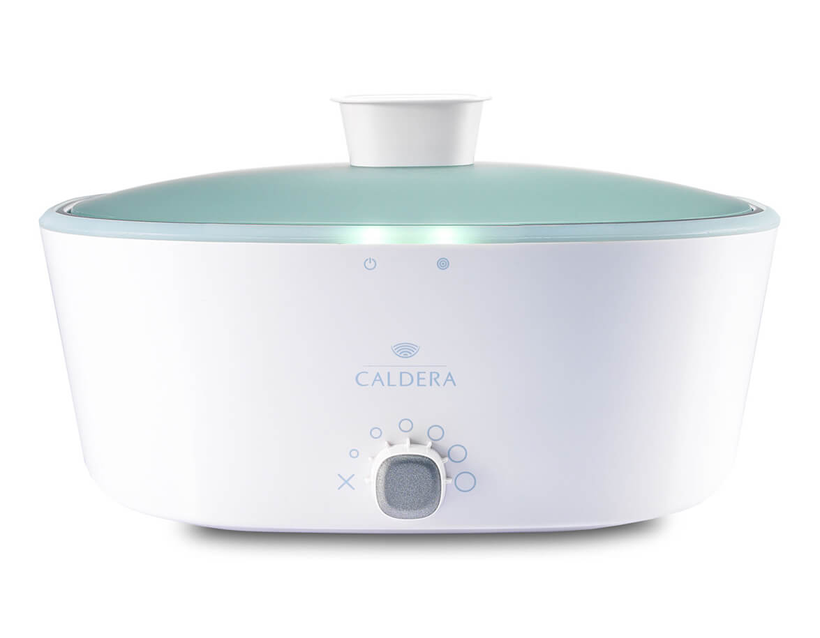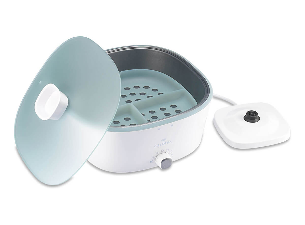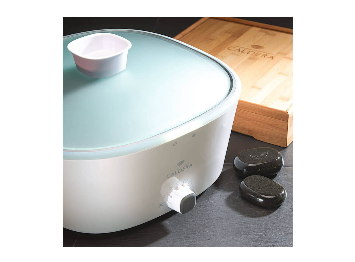 Elegantný dizajnový ohrievač lávových kameňov Caldera Professional, ktorý sa hodí do každého moderného masážneho a kozmetického salónu.