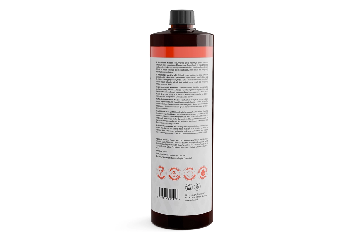 Anticelulitídny masážny olej CellaBella Citrus od velvesa obsahuje len čisto prírodné zložky. Jeho základom sú rastlinné oleje, ktoré vyživujú a zvláčňujú pokožku (slnečnicový, repkový, hroznový, mandľový a ricínový). Esenciálne oleje z bergamotu, limetky a grapefruitu spolu s extraktom z chilli papričiek podporujú prekrvenie pokožky, pohyb krvi a lymfy a pomáhajú pri odstraňovaní splodín metabolizmu a nadbytočnej vody z tkanív. Extrakt z rakytníka a vitamín E ako silné antioxidanty pokožku spevňujú a regenerujú.