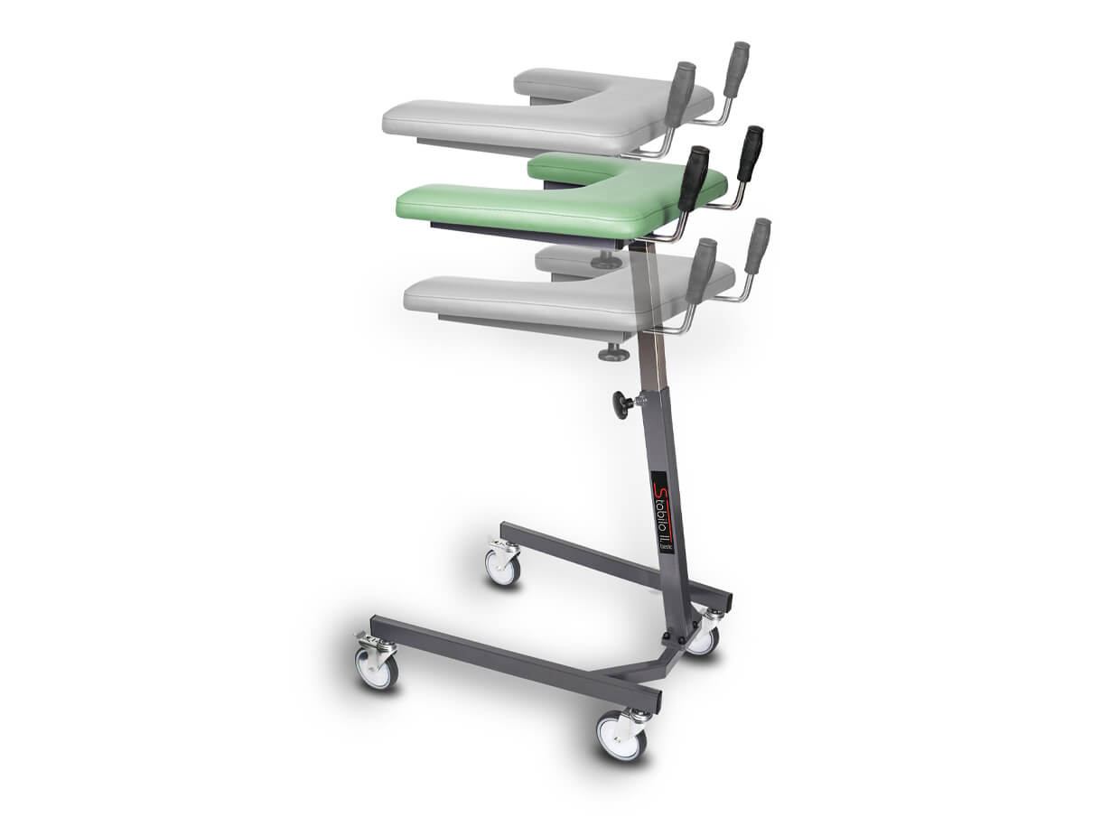 Základný model chodítka s opornou doskou pre nácvik chôdze a rehabilitáciu. Centrálny nosník je vyrobený z nehrdzavejúcej ocele, vďaka čomu je konštrukcia veľmi pevná aj pri vysunutí opornej dosky do maximálnej výšky. Chodítko je preto vhodné aj pre veľmi vysoké osoby (220 cm). 40 cm široké vykrojenie opory predlaktí umožňuje použitie chodítka aj pre osoby s mohutnejším hrudníkom.