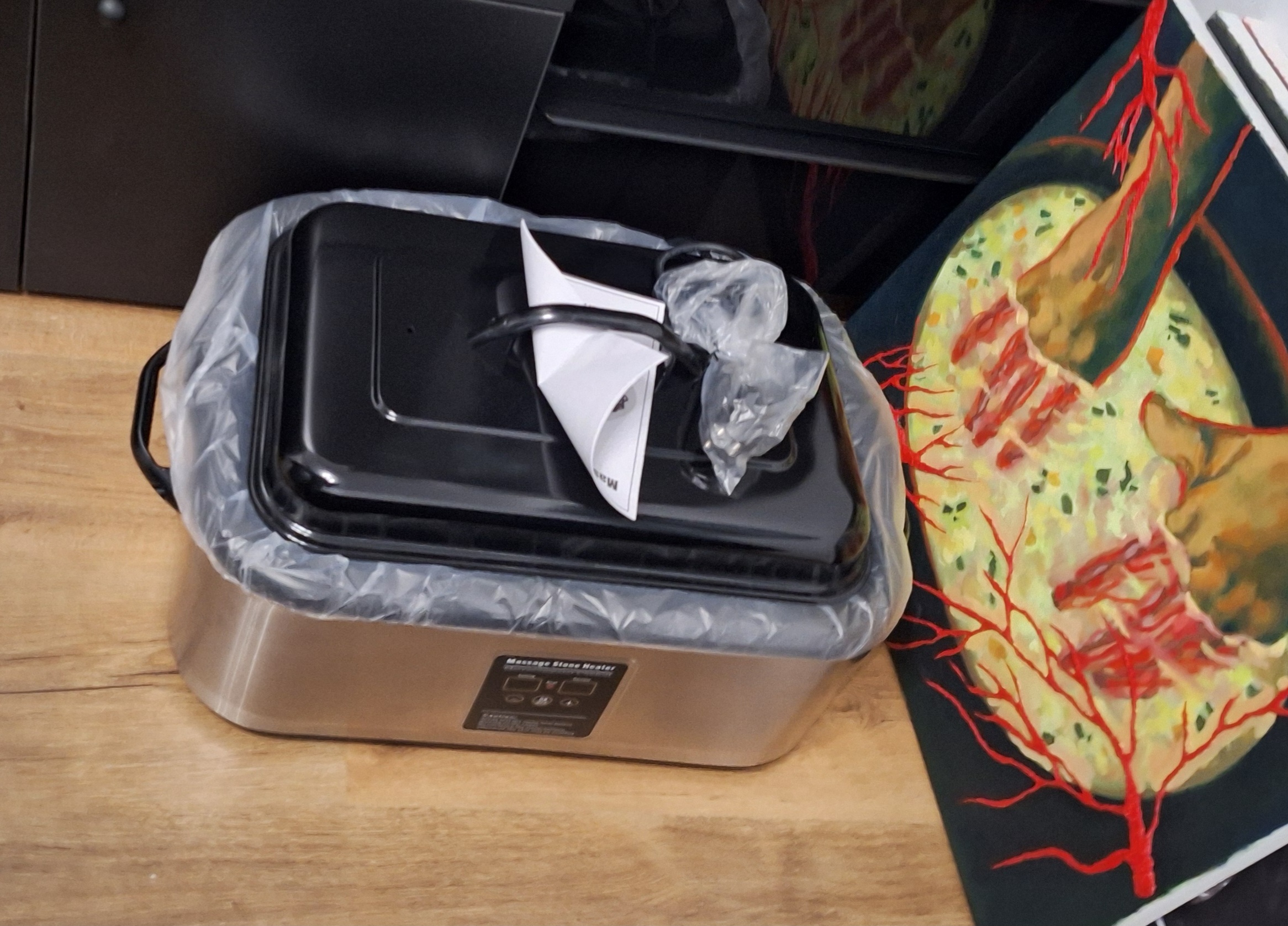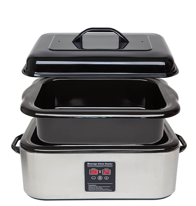 Profesionálny ohrievač kameňov s digitálnym regulovaním teploty. Telo prístroja je vybavené prívodným káblom, digitálnym displejom a teplu odolnými rukoväťami. Vnútorná vyberateľná nádoba je umývateľná. Na jej dno vkladáme poskladaný biely uterák, na ktorý rozložíme lávové kamene a doplníme vodu tak, aby boli kamene ponorené, no najviac po rysku s označením max na boku nádoby. Súčasťou setu je pokrievka.
