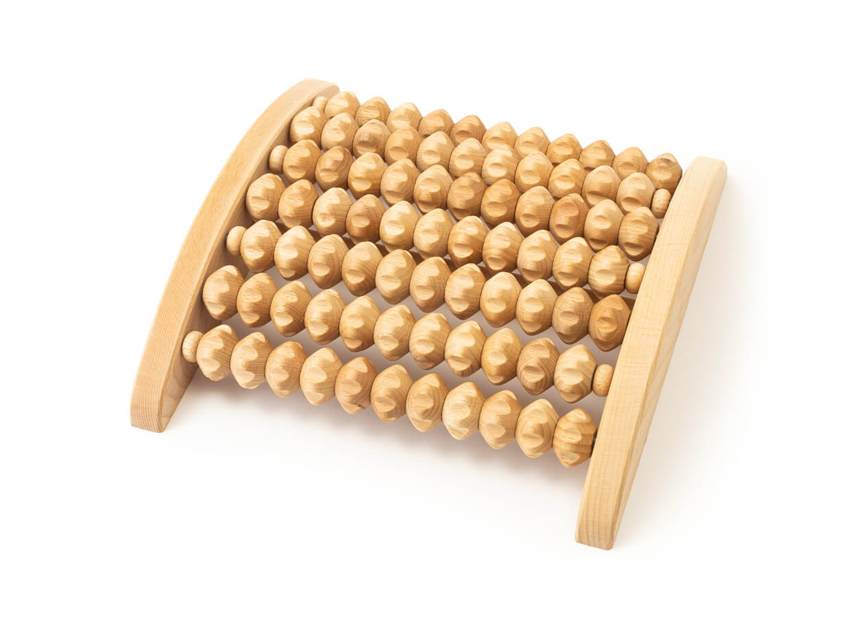 Drevený masažér na masáž unavených a napätých chodidel z bukového dreva. Masažér má 7 masážnych valčekov umiestnených do širokého oblúka, vďaka čomu dôkladne premasíruje celú plochu oboch chodidiel súčasne.