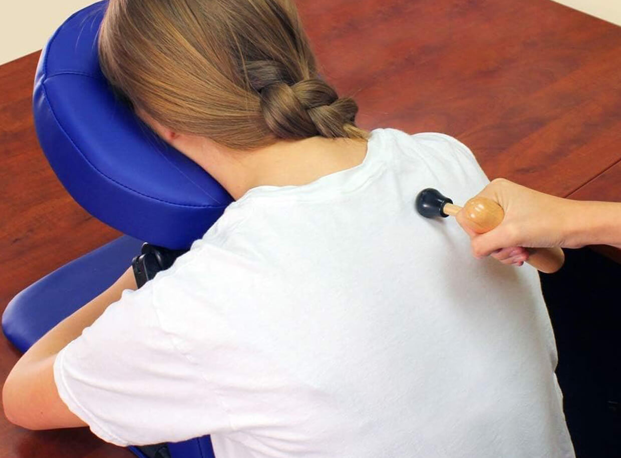 Najlepšie výsledky dosiahnete pri masáži bez použitia masážnych prostriedkov. Priložte zaoblenú špičku na bolestivé miesto v svale, uchopte bezpečne a pohodlne rukoväť a zatláčajte na trigger point v rôznych uhloch 10-30 sekúnd. Spolupracujte s klientom pri určení správneho tlaku a dozrite, aby ošetrovaný človek zhlboka dýchal. Môžete zintenzívňovať a uvoľňovať tlak alebo jemne pohybovať pomôckou do strán alebo do kruhu zhruba do oblasti veľkosti mince.