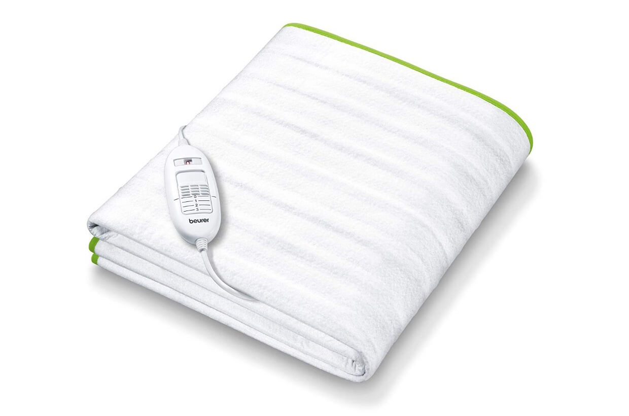 Doprajte si relaxáciu s vyhrievanou dekou Beurer TS 15 v štýlovom bielom dizajne so zeleným lemom. Prikrývka tiež obsahuje elastické prvky na upevnenie podložky na matrac.