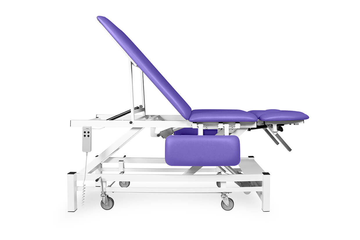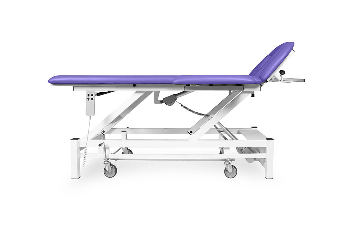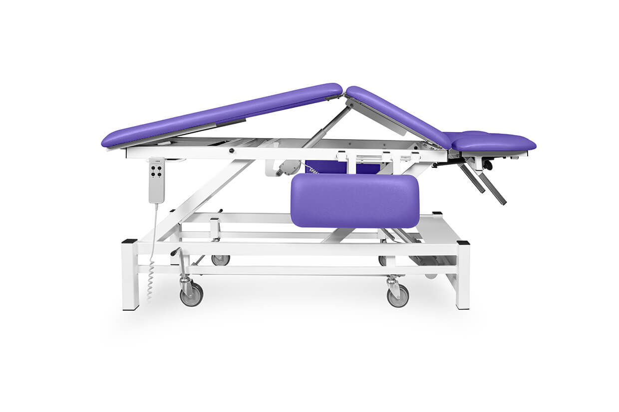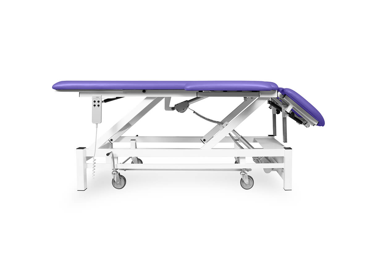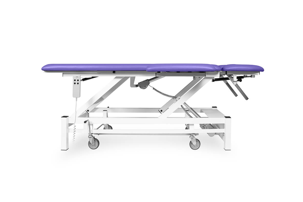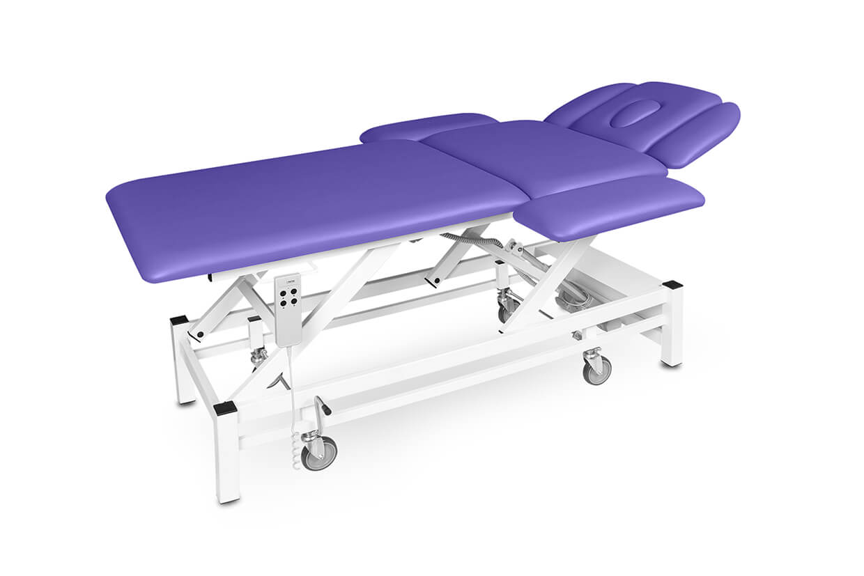 Profesionálne trojdielne elektricky polohovateľné lehátko so spoľahlivým a tichým motorom vhodné pre masérov a fyzioterapeutov. Lehátko je pohodlne čalúnené 4 cm hrubým molitanom a kvalitnou, ľahko čistiteľnou koženkou a vybavené nastavovateľnými protišmykovými nožičkami. Vrchný a spodný (V zdvih) diel lehátka sa dajú polohovať pomocou plynovej vzpery. V cene lehátka je ručný ovládač.