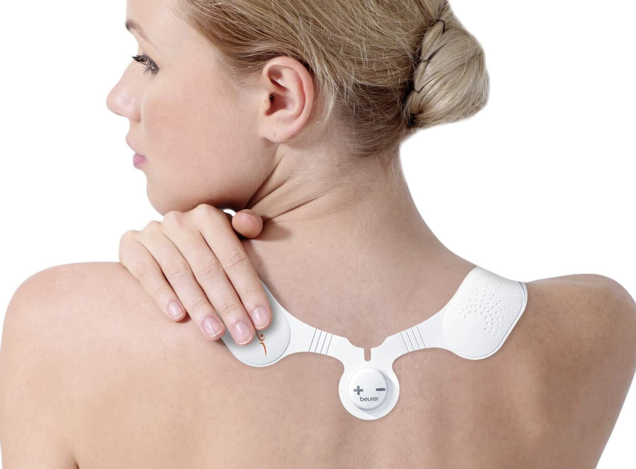 Elektrostimulátor BEURER EM 20 na posilnenie a regeneráciu svalov v oblasti krku, ramien a chrbta. Prístroj je vyrobený z tenkého silikónu, má ergonomický tvar a vďaka samolepiacim gélovým náplastiam pevne drží na pokožke.