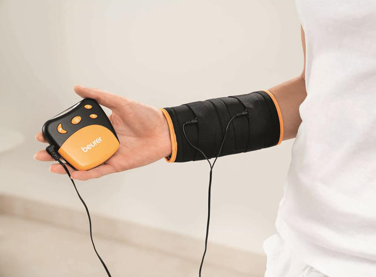 Elektrostimulátor BEURER EM 28 TENS je zariadenie pre nervovú stimuláciu zápästia. Vo vnútri manžety sa nachádzajú kontaktné elektródy, ktoré cez pokožku stimulujú nervy a tým tlmia bolesti, urýchľujú regeneráciu a zvyšujú tvorbu endorfínov.