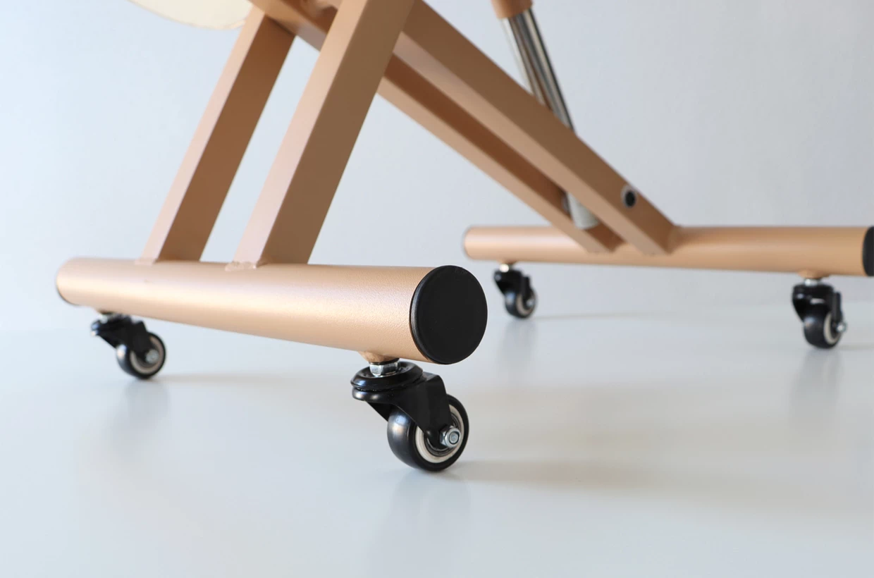 Ergonomická kľakačka s pevnou oceľovou konštrukciou a kolieskami je výškovo nastaviteľná (6 stupňov), aby si každý používateľ našiel správnu polohu zodpovedajúcu jeho výške a stavbe tela. Vysoké čalúnenie a jemná soft-touch koženka zaručujú pohodlné sedenie pre celý pracovný deň a bezproblémové čistenie. Štyri kolieska umožňujú jednoduché posúvanie sa v rámci pracovných aktivít.
