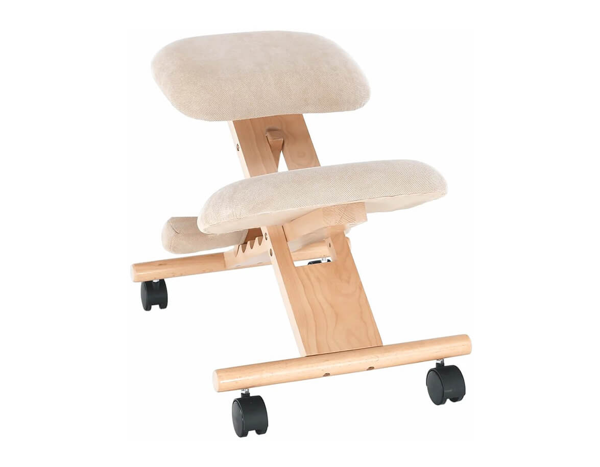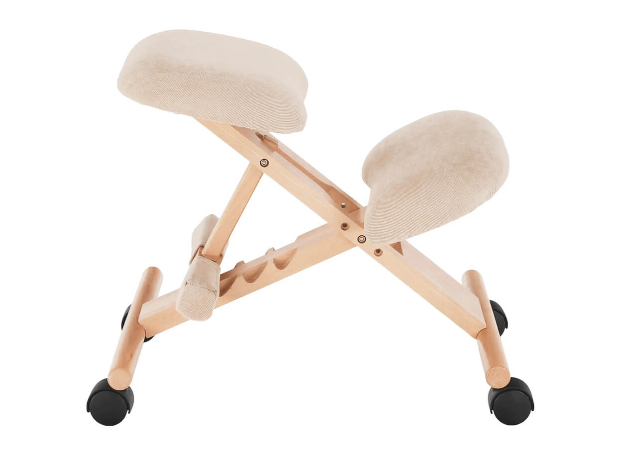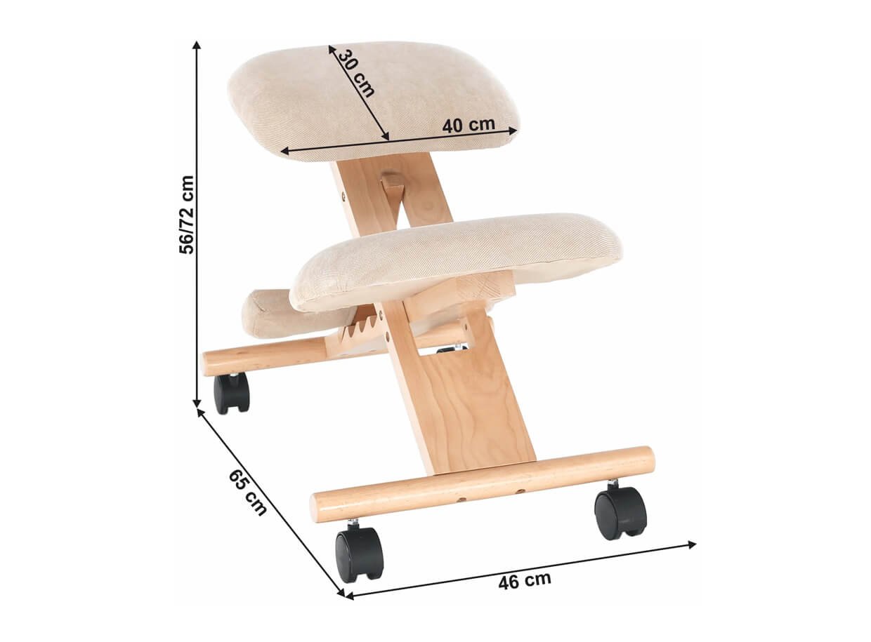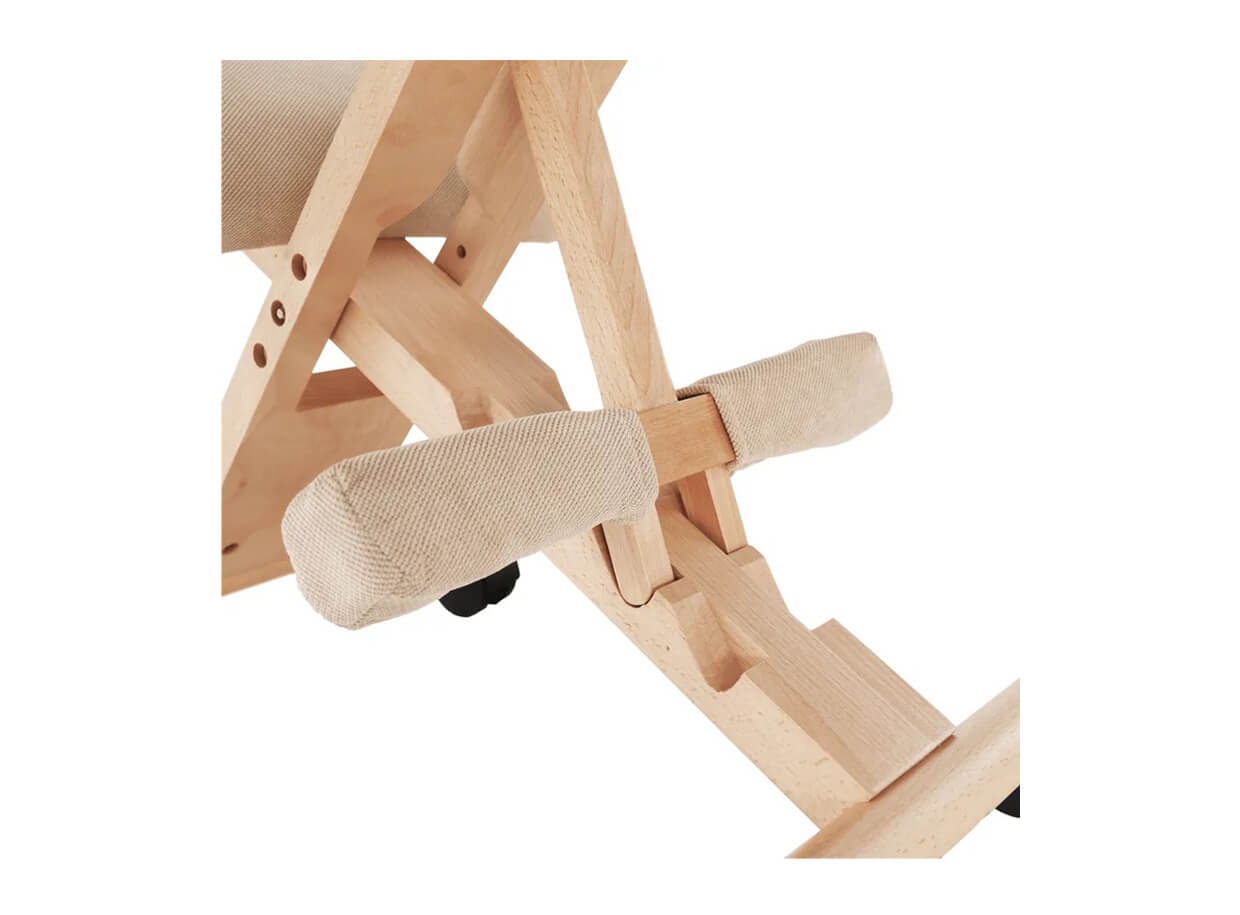 Kľakačka je vyrobená z dubového dreva a opierky sú vystužené a čalúnené látkou pre pohodlné sedenie. Disponuje kolieskami pre jednoduchý pohyb. Konštrukcia kľakačky je flexibilná a je možné nastaviť výšku sedu a súčasne uhol sklonu operadla kolien.