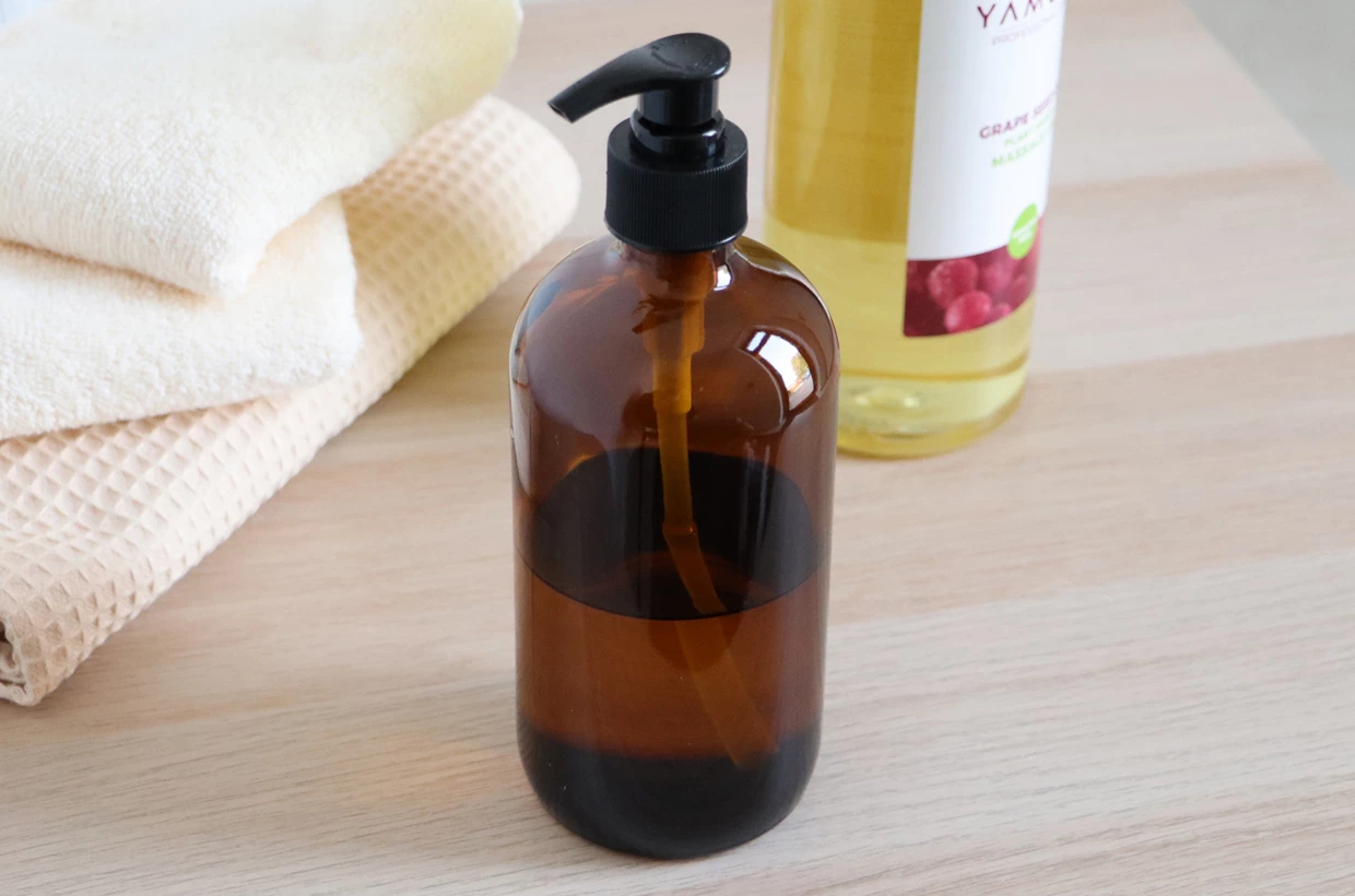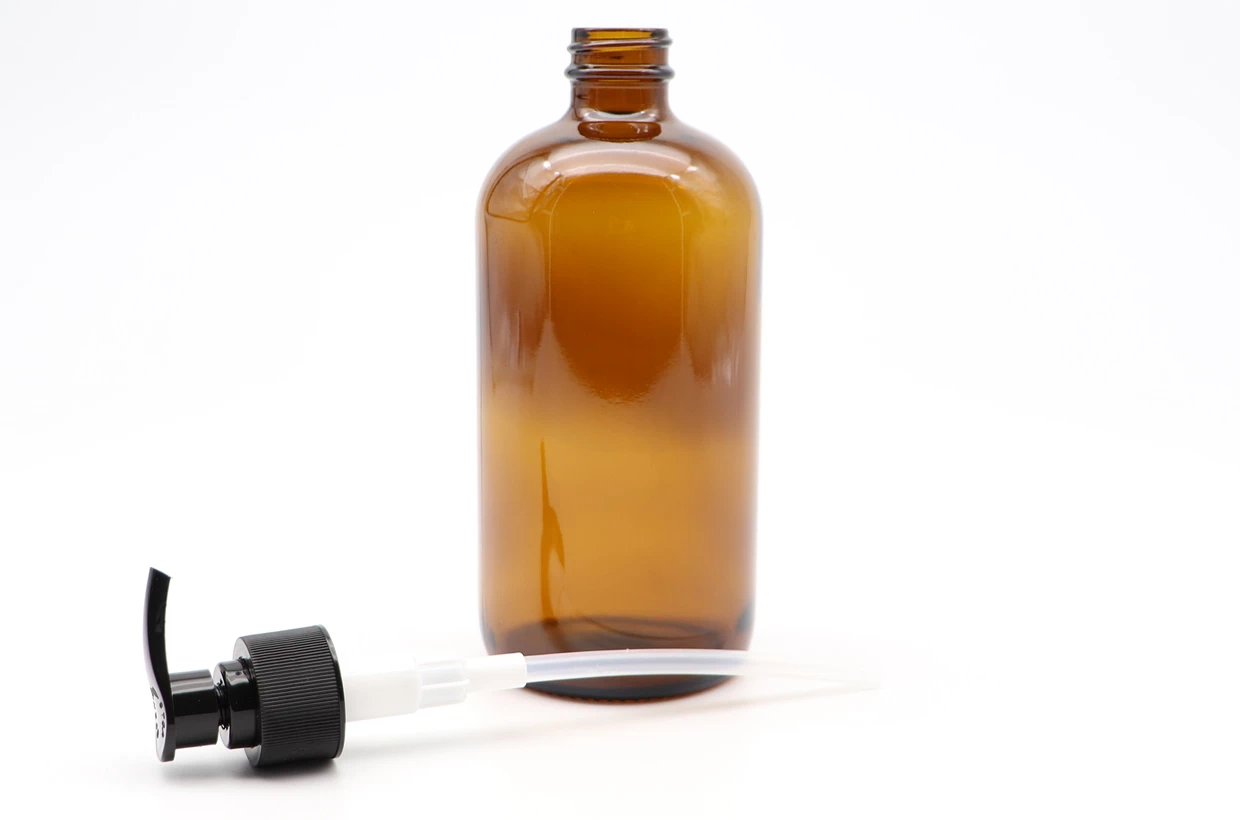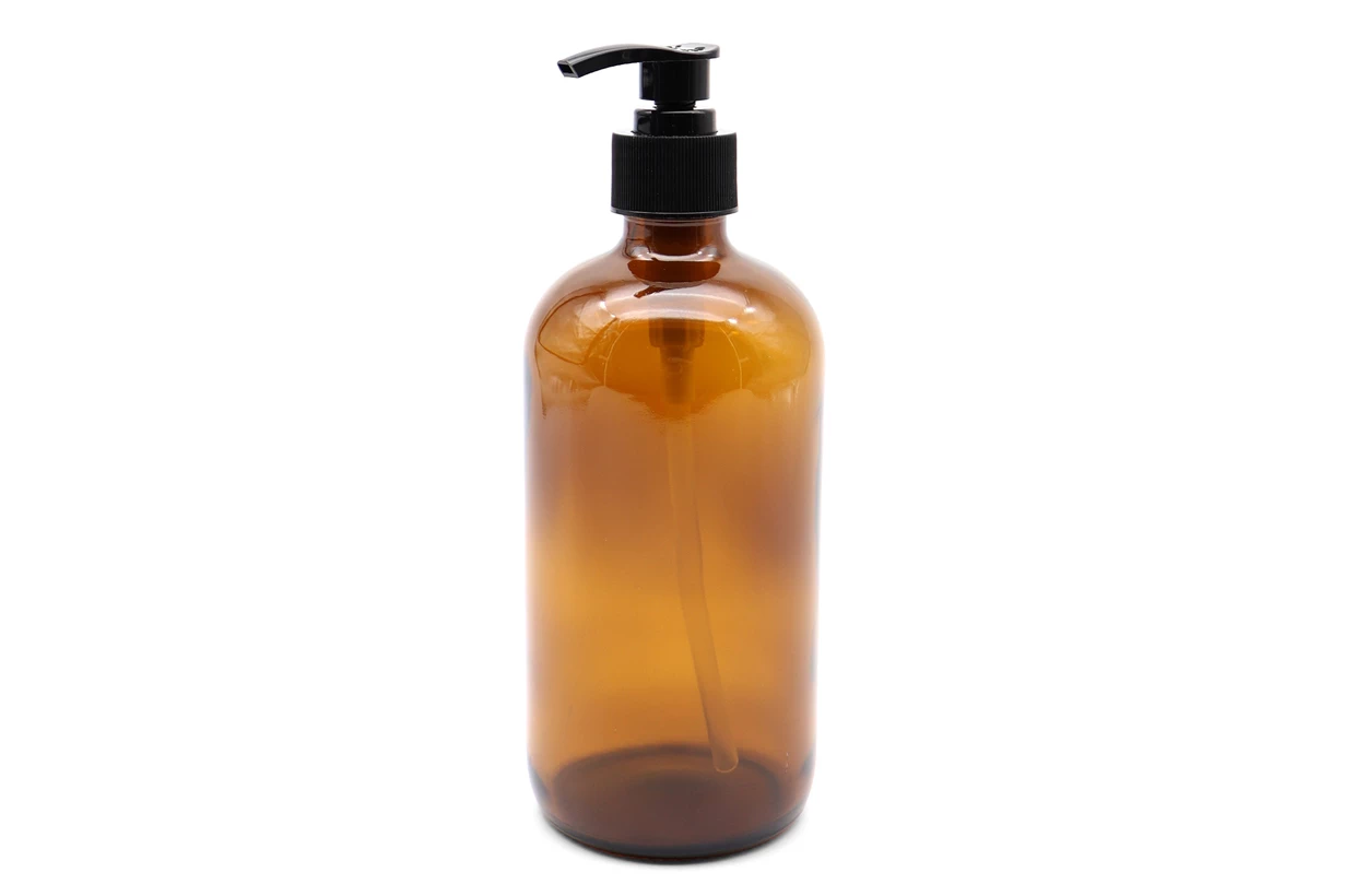 Fľaša z jantárového skla s dávkovačom má klasický elegantný dizajn a využitie nájde najmä v masážnych salónoch a kozmetických štúdiách.