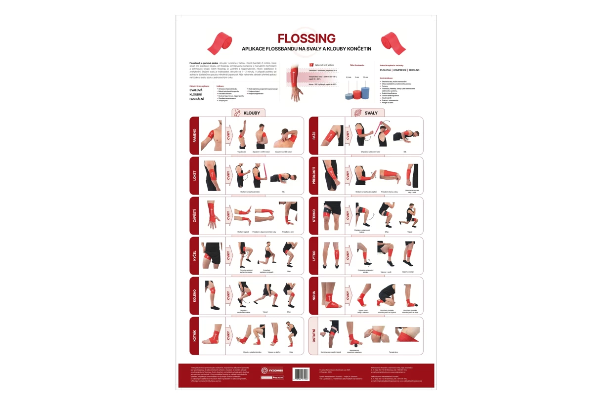 Plagát Flossing prostredníctvom fotografií vyobrazuje konkrétne spôsoby aplikácie kompresnej gumy na svaly a kĺby končatín, ktoré sú doplnené o jednoduché cviky. Aplikácie a cviky sú rozdelené podľa jednotlivých partií, vďaka čomu je plagát prehľadnou pomôckou.
