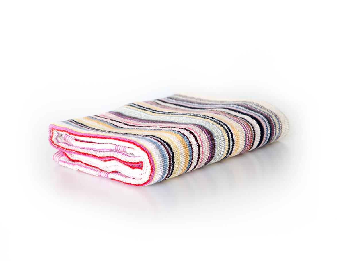 Froté uterák je vyrobený zo 100% bavlny, vďaka čomu dobre saje, rýchlo sa suší, je mäkký a má dlhú životnosť. Uterák má celoplošne pruhovaný vzor a každý jeden má unikátnu farebnú kombináciu.