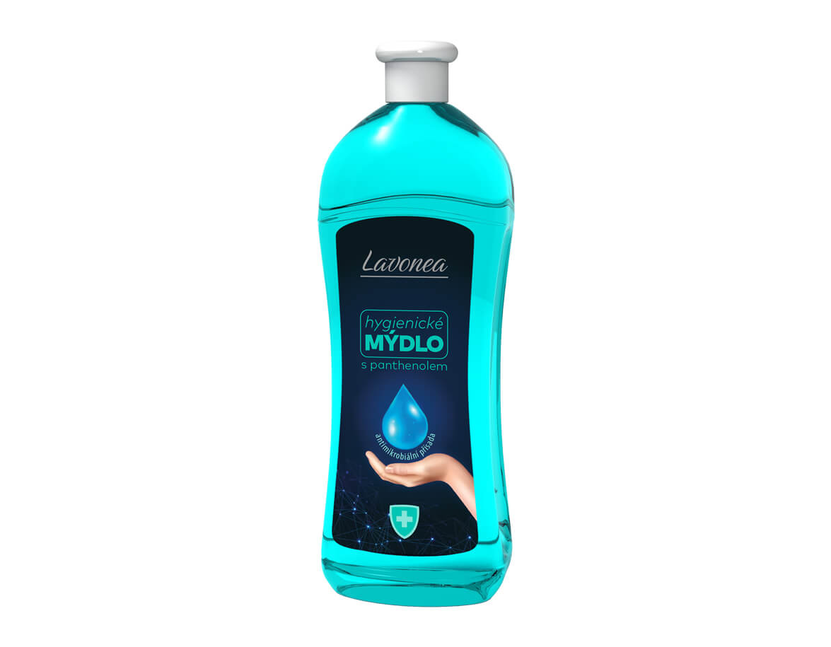 Tekuté mydlo s panthenolom a mikrobiálnym zložením pre efektívnu a hygienickú starostlivosť o pokožku rúk.