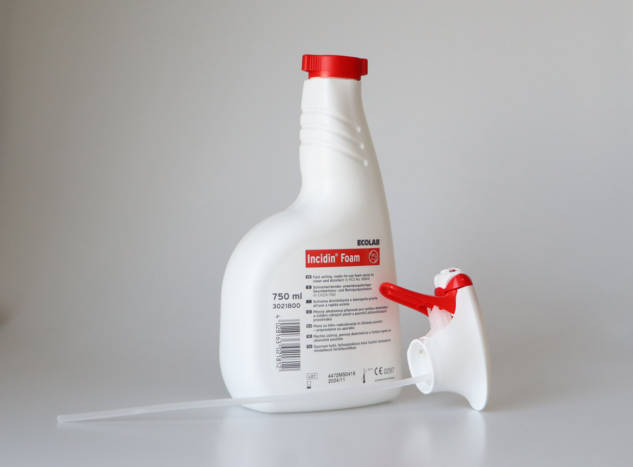 Rýchlo účinný prípravok na okamžité použitie určený na penové čistenie a dezinfekciu masážnych lehátok / zdravotníckych pomôcok.