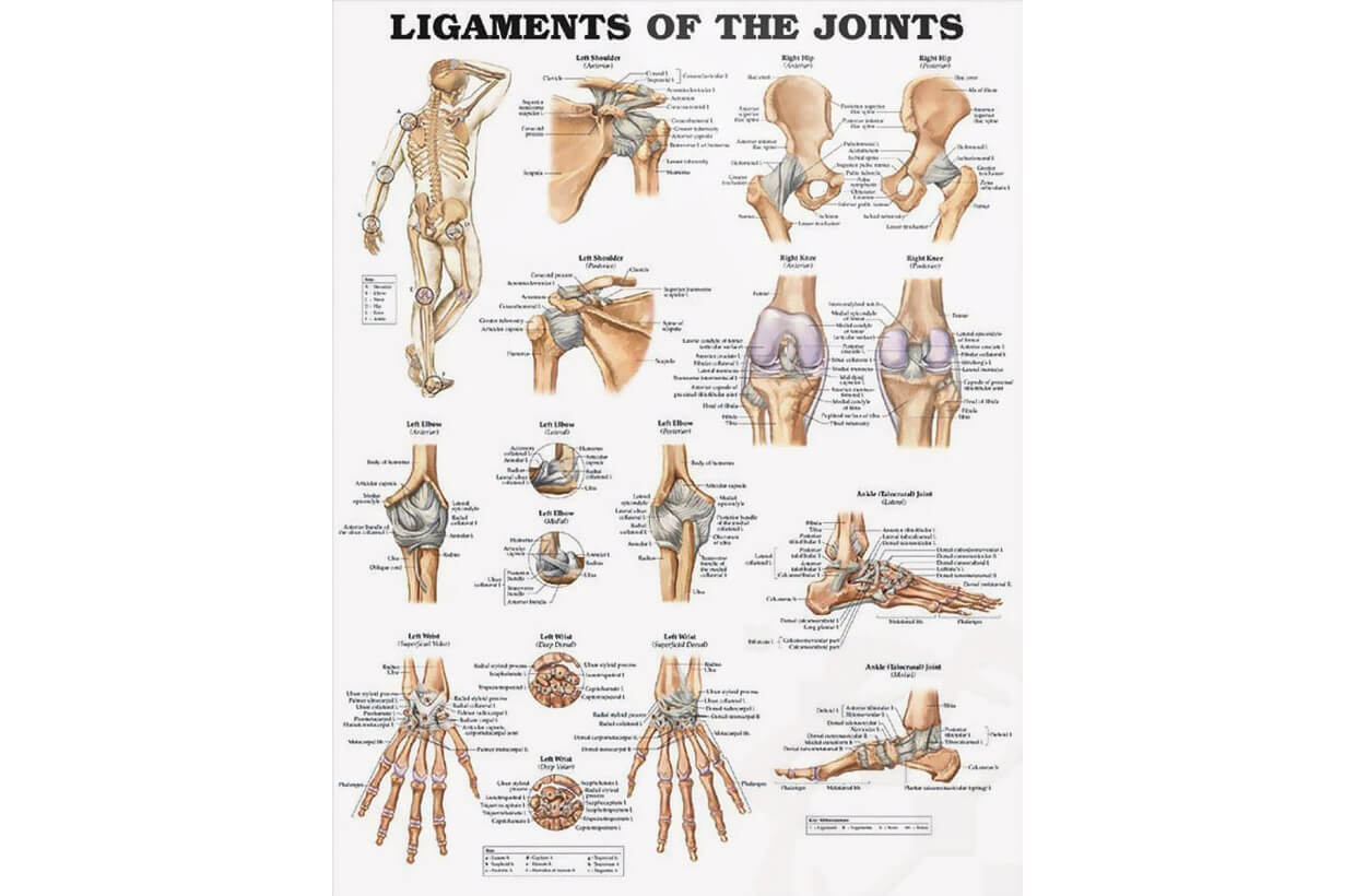 Zobrazenie umiestnenie jednotlivých spojov, predný a zadný pozľad na ľavom ramene, pravé bedro, pravé koleno a ľavé koleno. Tiež bočné a mediálne pohľady na ľavé koleno a členok.