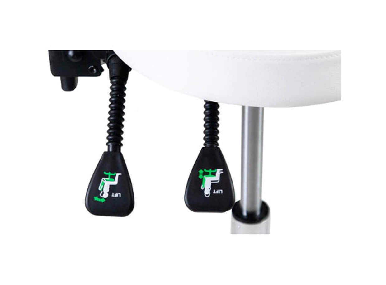 Pomocou troch ručných páčok pod sedadlom si môžete nastaviť výšku stoličky, sedáku a sklon opierky.