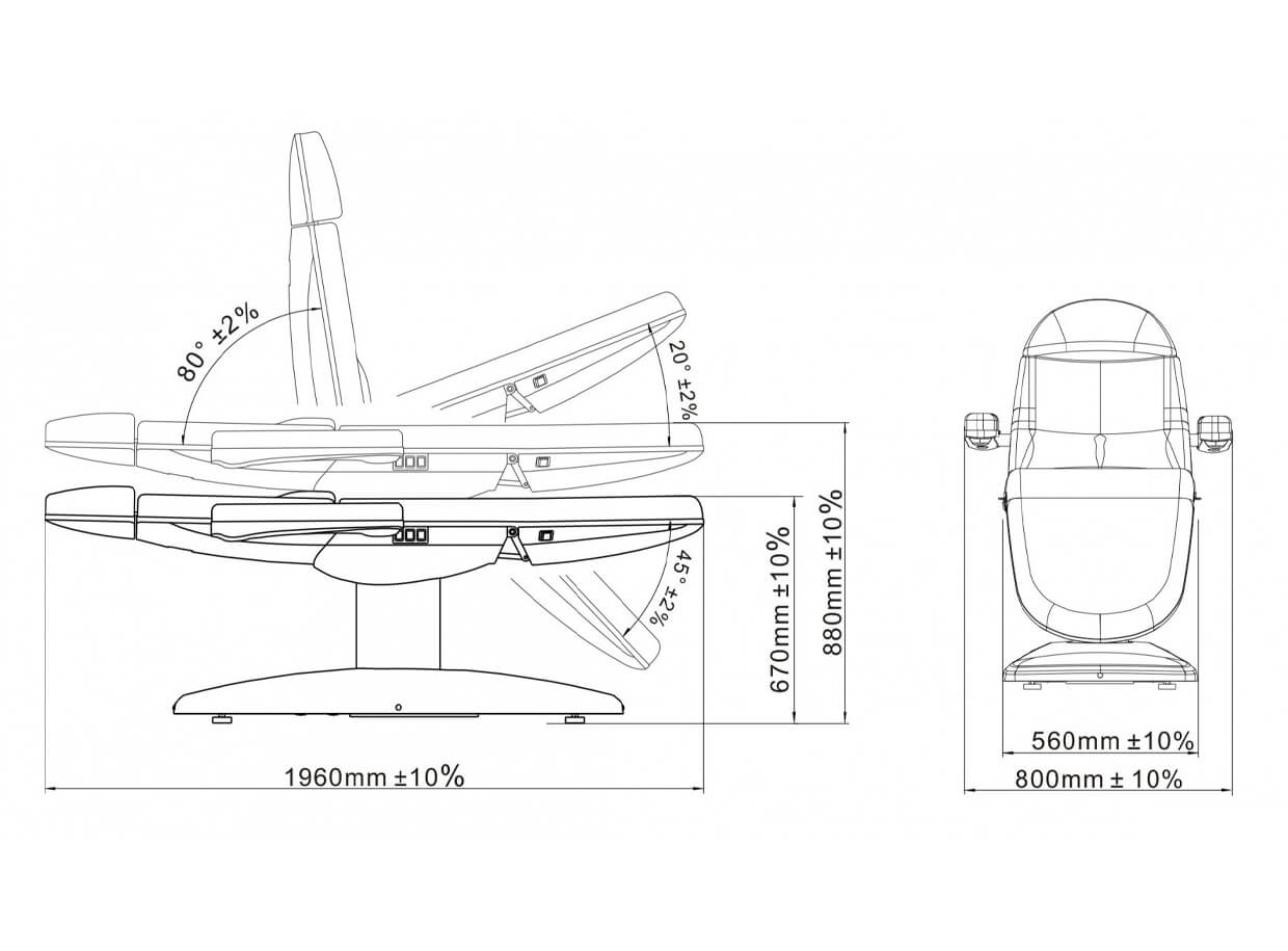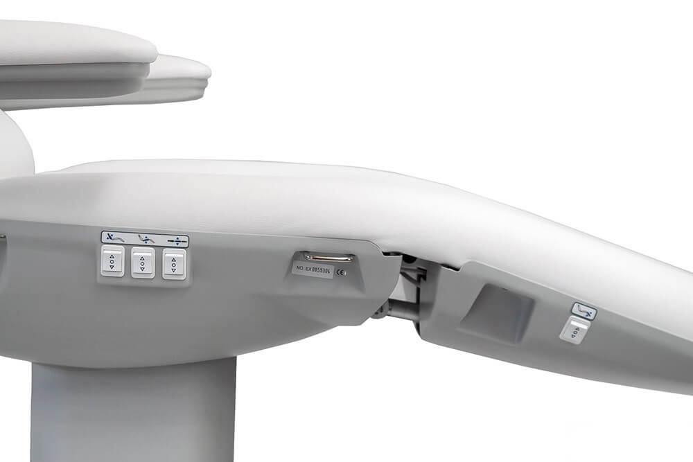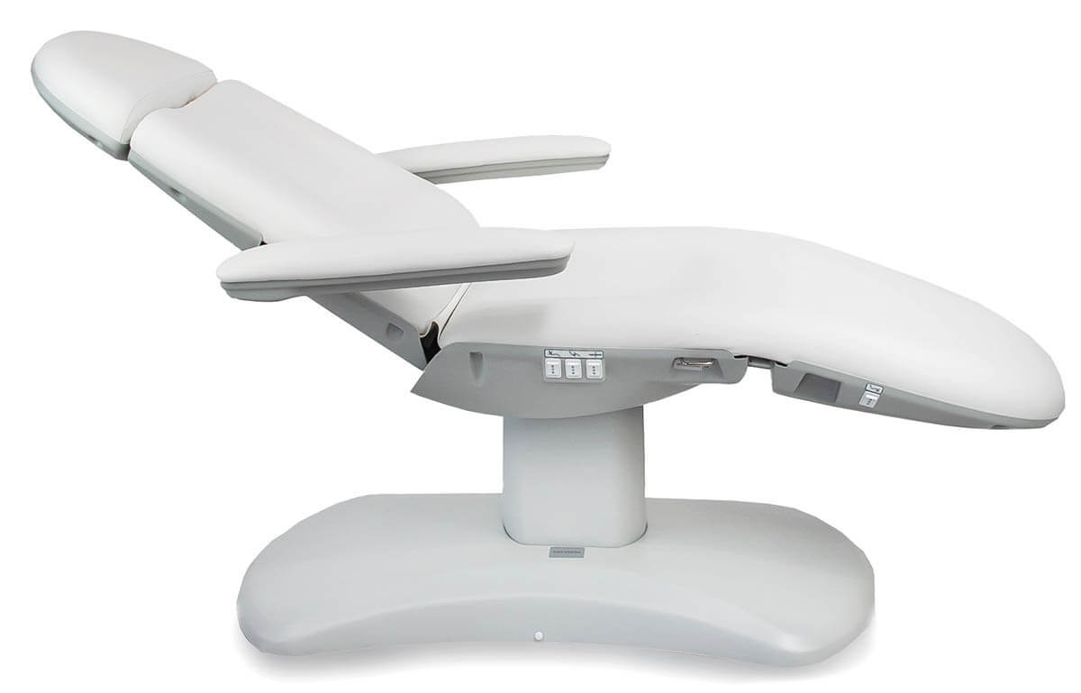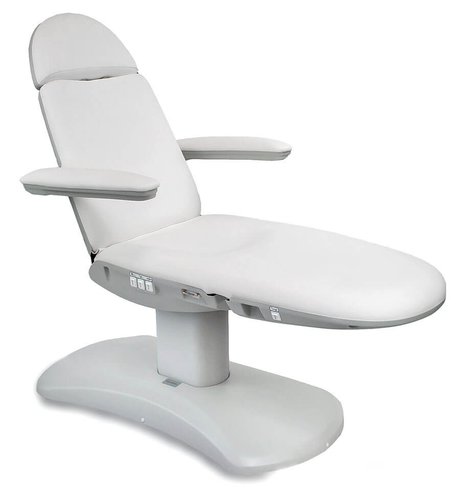 Hlavová opierka lehátka je vysúvateľná a prispôsobí sa tak i vyššej postave. Výklopné lakťové opierky umožňujú bezproblémový prístup ku klientovi. Kreslo je čalúnené odolnou syntetickou kožou s ľahkou údržbou a čistením. Anatomicky tvarované polstrovanie zaručuje pohodlný posed.