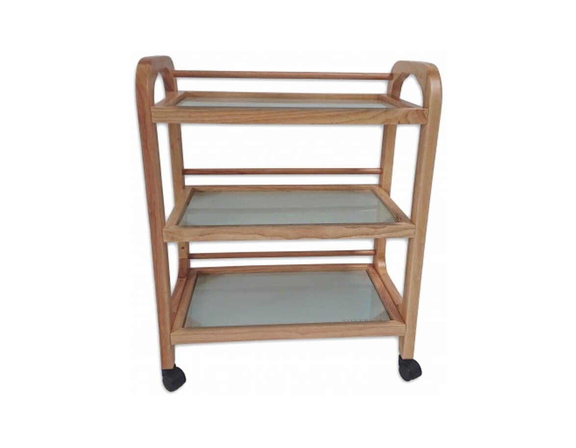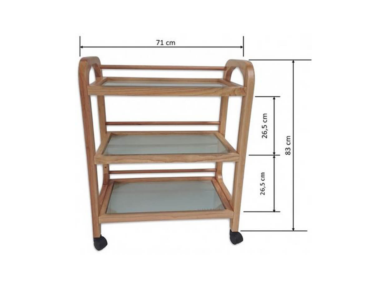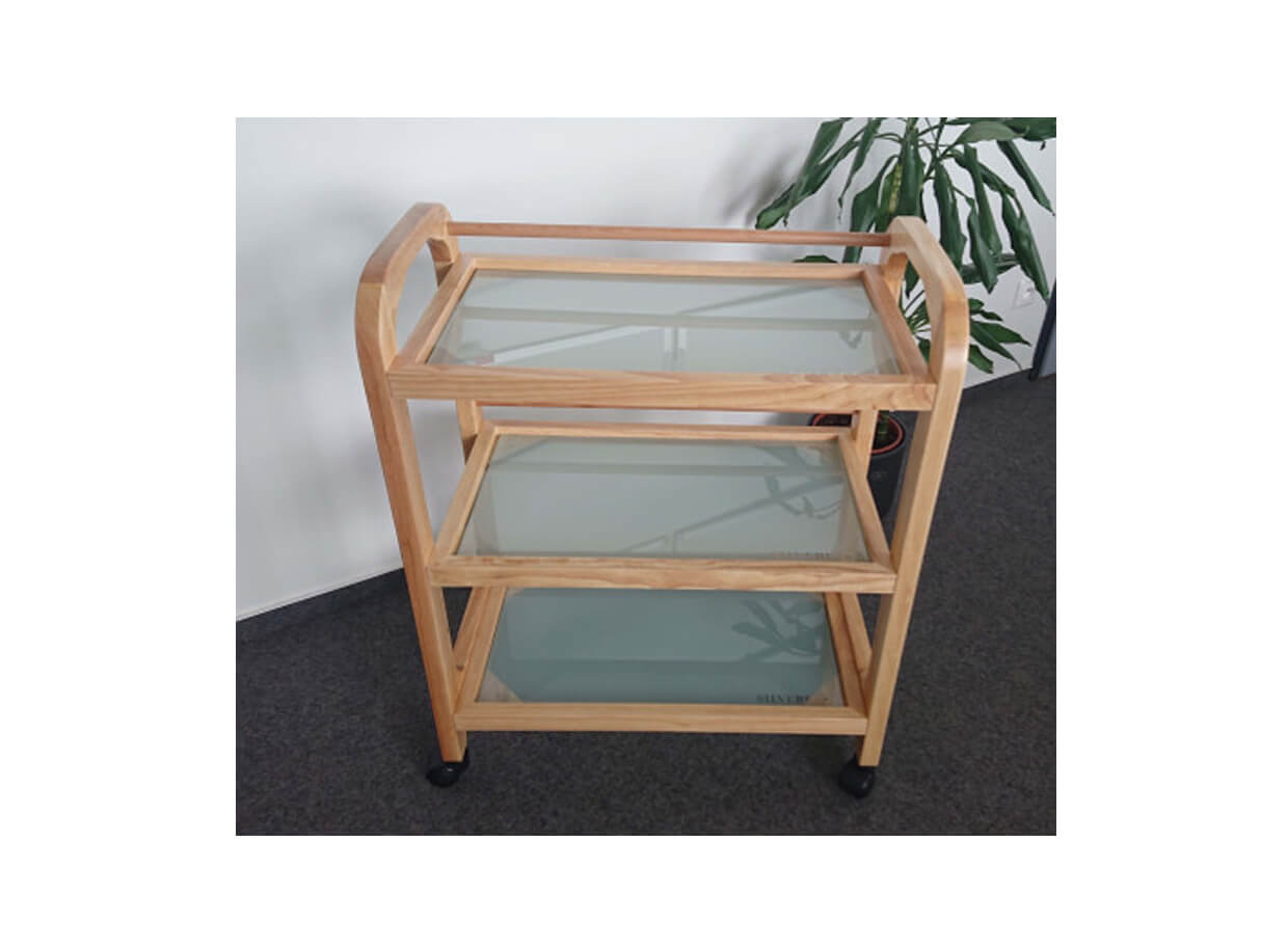 Zaoblená konštrukcia z dreva s troma policami z tvrdeného mliečneho skla je doplnená praktickými kolieskami. Každé poschodie má v zadnej časti vloženú tyčku, aby veci z políc pri pohybe stolíka nepadali.