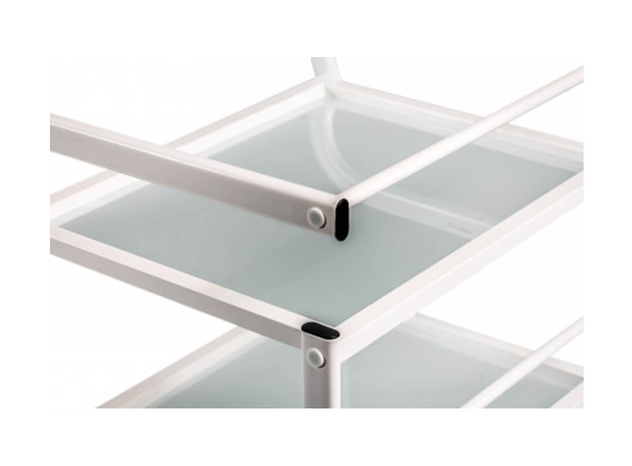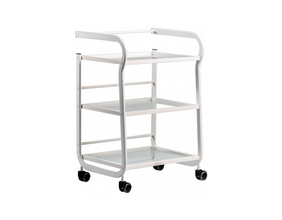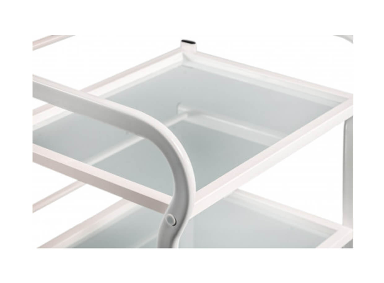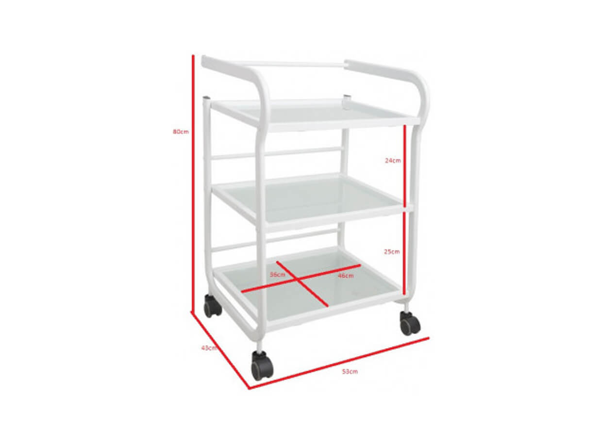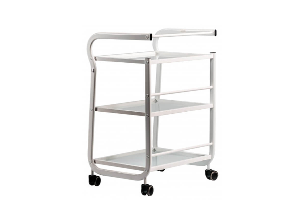 Elegantný stolík Vision s kovovou konštrukciou a otvorenými sklenenými poličkami. Vozík je plne mobilný a ľahko sa premiestňuje. Rozmery poličiek poskytujú priestor na odkladanie masážnych pomôcok, lávových kameňov, baniek na bankovanie alebo tejpov.