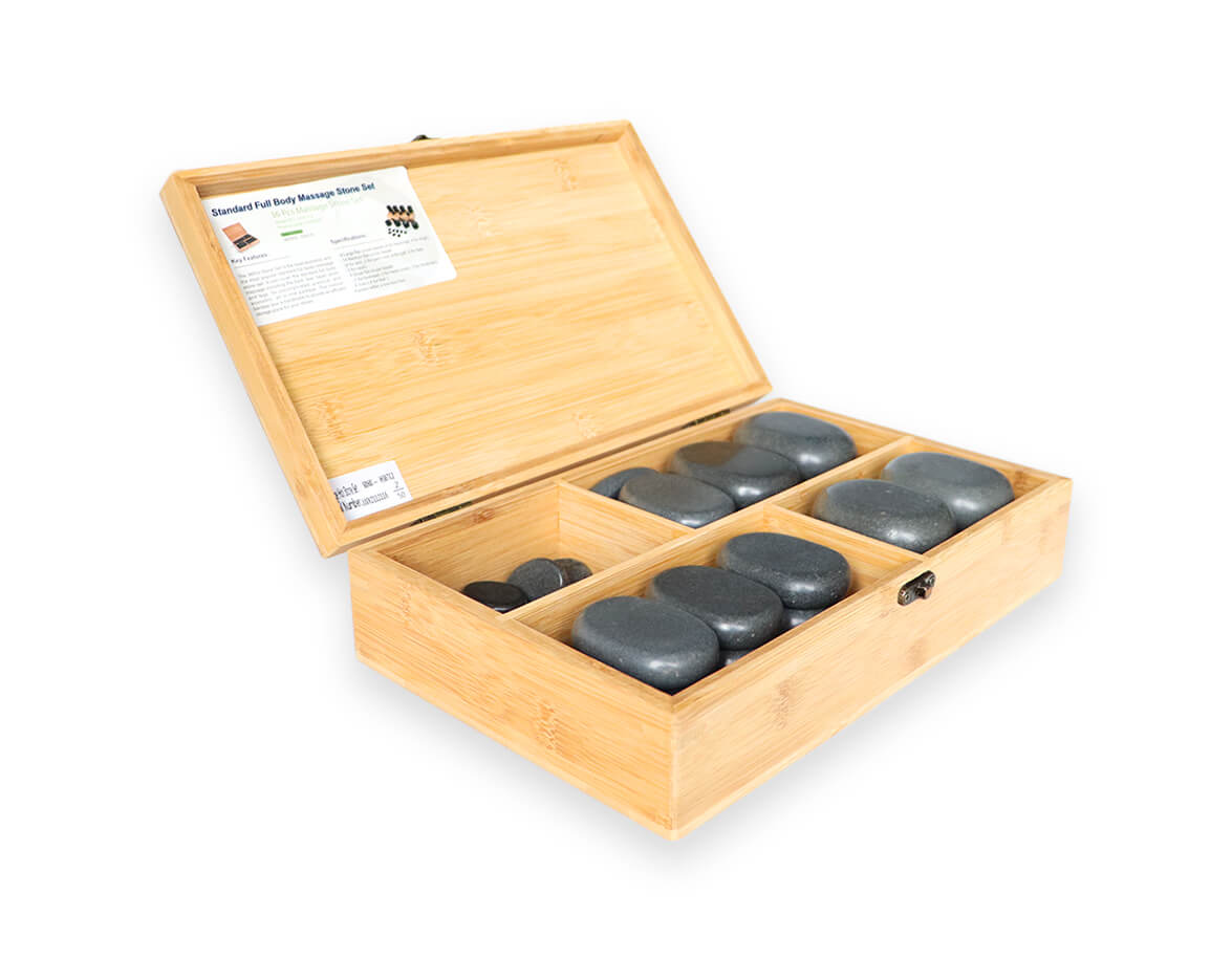36 kusový set lávových kameňov v bambusovej krabičke. Masážne kamene majú veľkosti prispôsobené rozličným častiam tela. Sú ručne vyrobené z čadiča, lávového kameňa, ktorý teplo rýchlo absorbuje a dlhodobo udržiava. Sú leštené bez použitia vosku alebo chemikálií, hladké a majú oblé hrany, vďaka ktorým jednoducho kĺžu po pokožke.