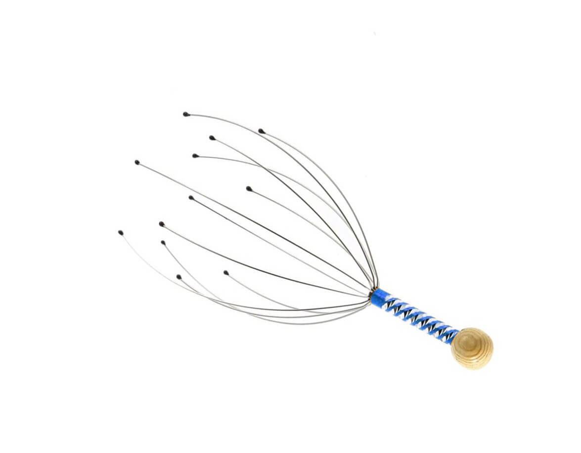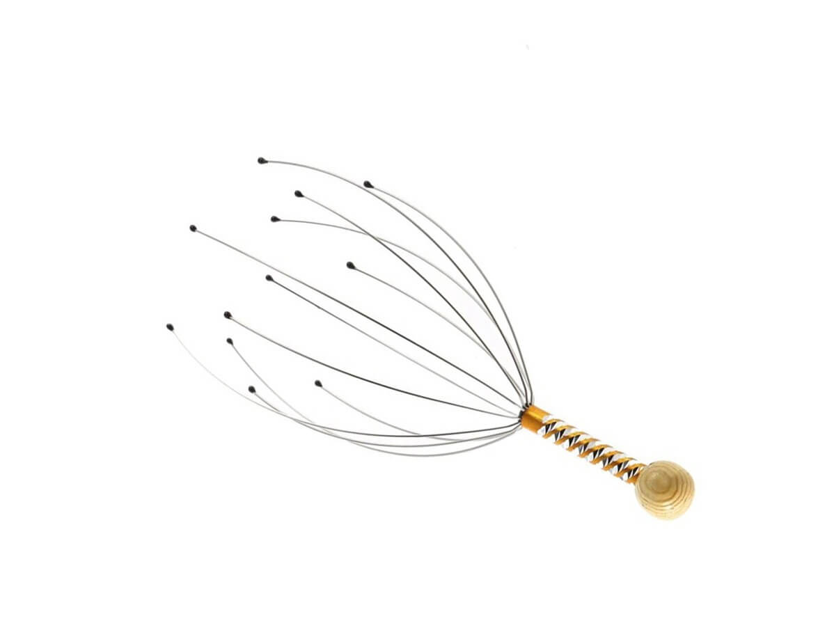 Masážna pomôcka na uvoľňujúcu masáž hlavy. Tenké ľahučké kovové výbežky ukončené jemnými guľôčkami masírujú pokožku hlavy a stimulujú nervové zakončenia. Pre rýchly relax celého tela, zmiernenie napätia, stresu a bolestí hlavy. Prekrvenie pokožky hlavy tiež podporuje rast vlasov. Pomôcka sa dá použiť aj na upokojujúcu masáž ramena, lakťa alebo kolena.