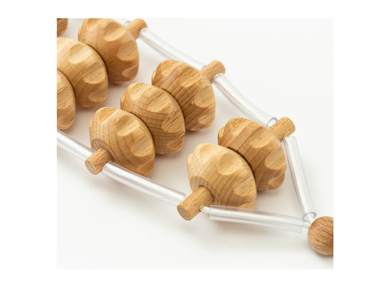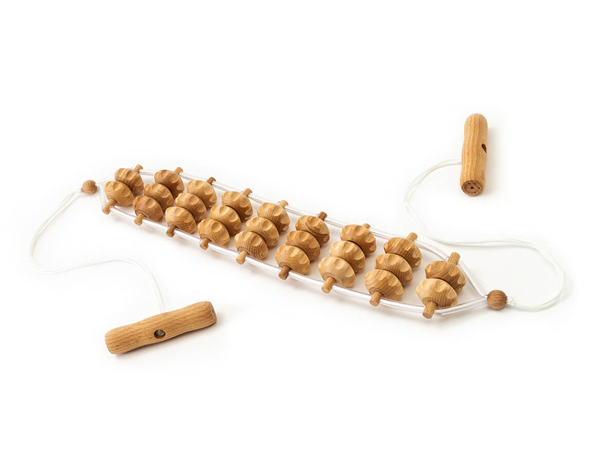 Masážny pás z bukového dreva je zostavený z 25 tvarovaných masážnych valčekov. Je výborný na automasáž chrbta, pása, bokov, zadočku a stehien. Používa sa aj v profesionálnych masážnych salónoch.