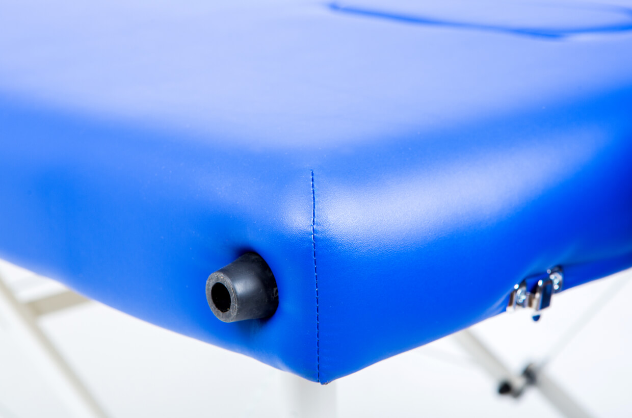 Masérsky stôl je je čalúnený kvalitnou, na dotyk hebkou koženkou typu soft-touch, ktorá sa ľahko čistí. Pre príjemný pocit klienta je výstelka zhotovená z molitanu v hrúbke 4 cm s vysokou hustotou, takže je pre klienta dostatočne komfortná. Podhlavník je veľmi pohodlne riešený, švy sú umiestnené tak, aby netlačili klienta do tváre a celkový strih zaručuje stabilné a pohodlné opretie hlavy. Nechýba ani otvor pre tvár umiestnený priamo v konštrukcii uzavretý zátkou, ktorú možno v prípade potreby jednoducho vytiahnuť.
