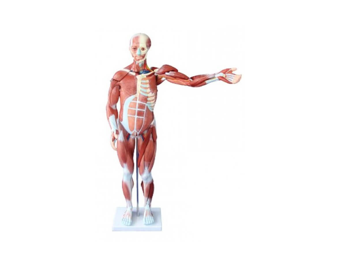 Model celého ľudského tela muža s ručne maľovanými odnímateľnými svalmi a vnútornými orgánmi. Jednotlivé časti modelu sú vyrobené z odolnej gumy a jednoducho sa rozoberajú a skladajú.