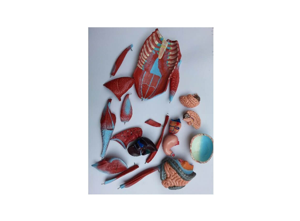Základná konštrukciu ľudského tela, prierez lebky, mozog zložený z 2 častí, hrudná a brušná stena, pravé rameno, ľavé rameno zložené z 5 častí, noha zložená z 9 častí, pľúca zložené z 2 častí, srdce zložené z 2 častí, pečeň, žalúdok a črevá.
