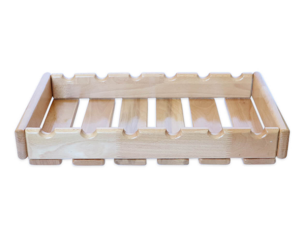 Box z lakovaného bukového dreva. Box má 6 zárezov, do ktorých zapadnú rukoväte valčekov alebo časť boxu môžete využiť ako odkladací priestor pre ostatné nástroje a pomôcky pre maderoterapiu.