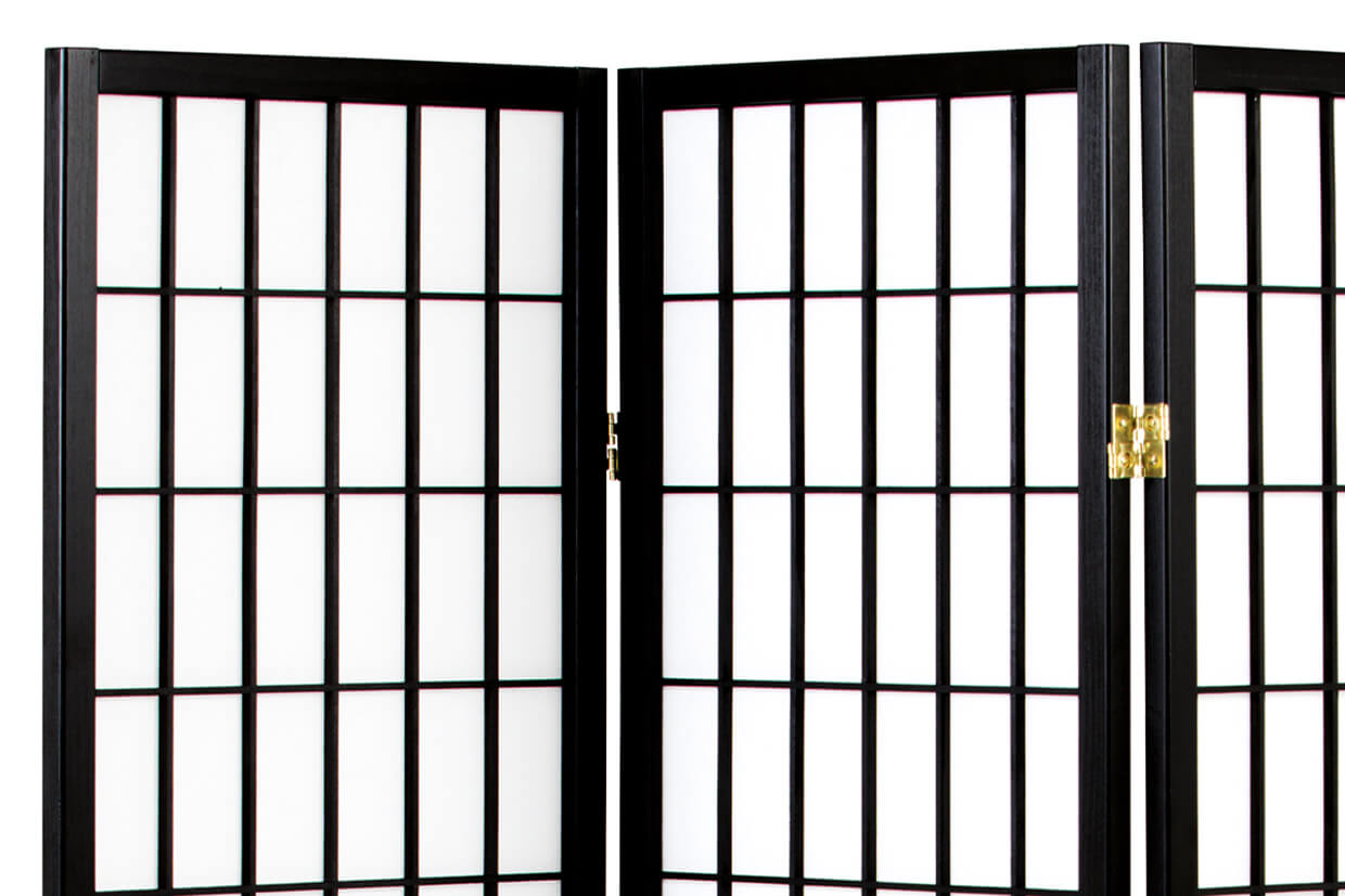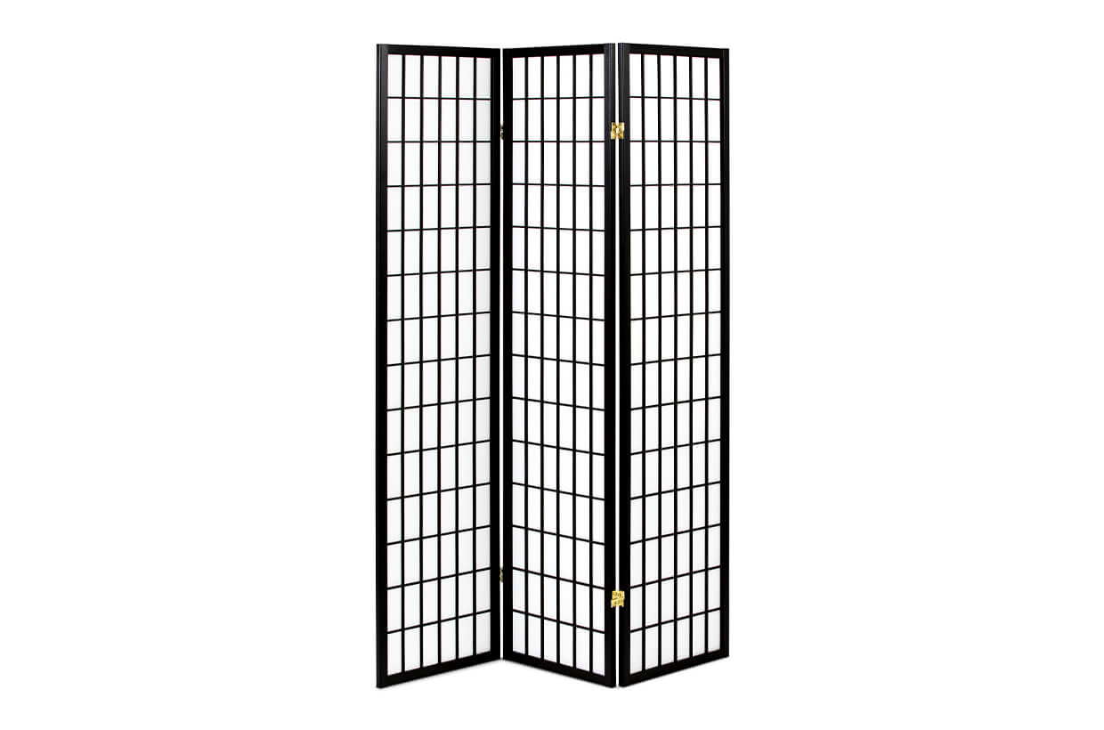 Moderný trojdielny paraván s drevenou konštrukciou z masívneho smreku v čiernej farbe.