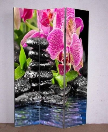 3-dielny paraván Kameň-voda-kvet s fotopotlačou z oboch strán.