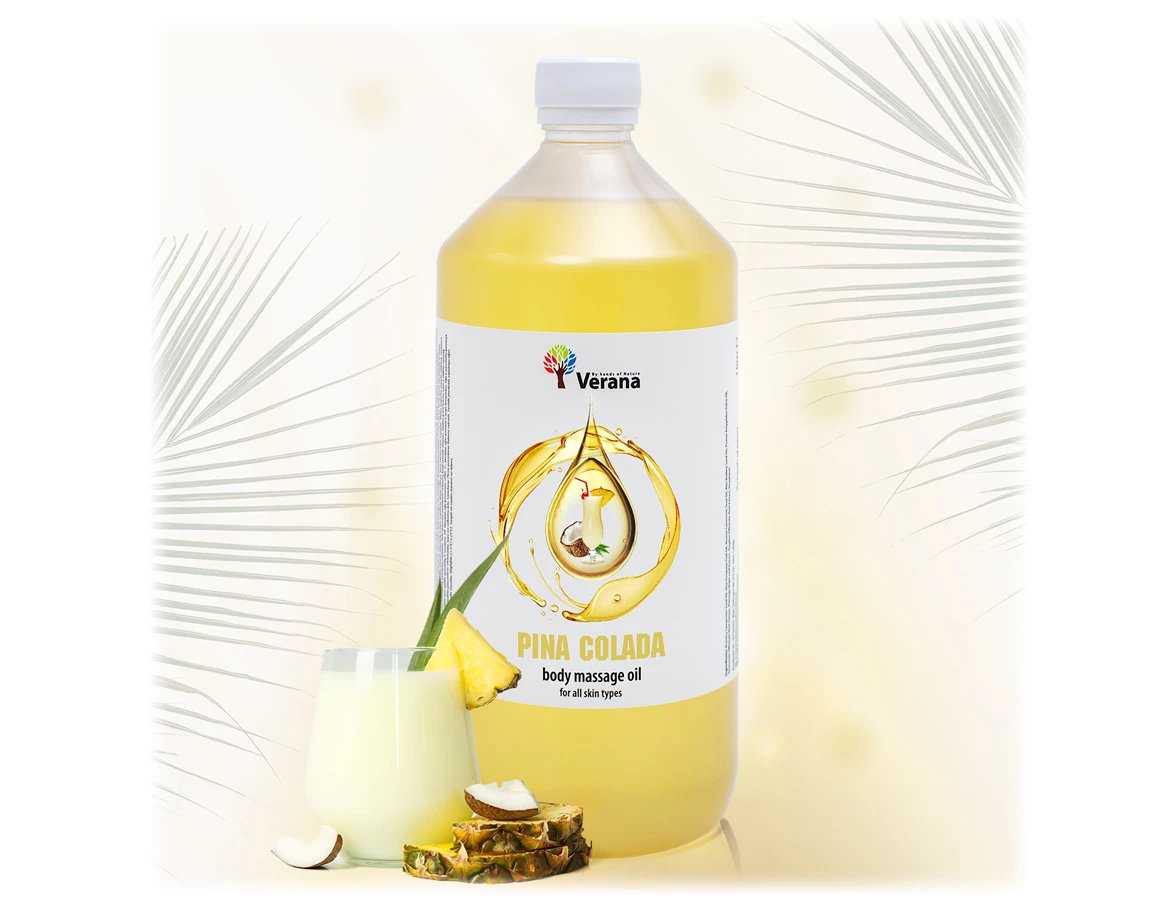 Masážny olej s vôňou exotického koktejlu Piňa Colada na regeneračnú a omladzujúcu masáž celého tela.