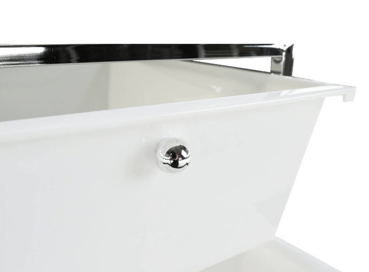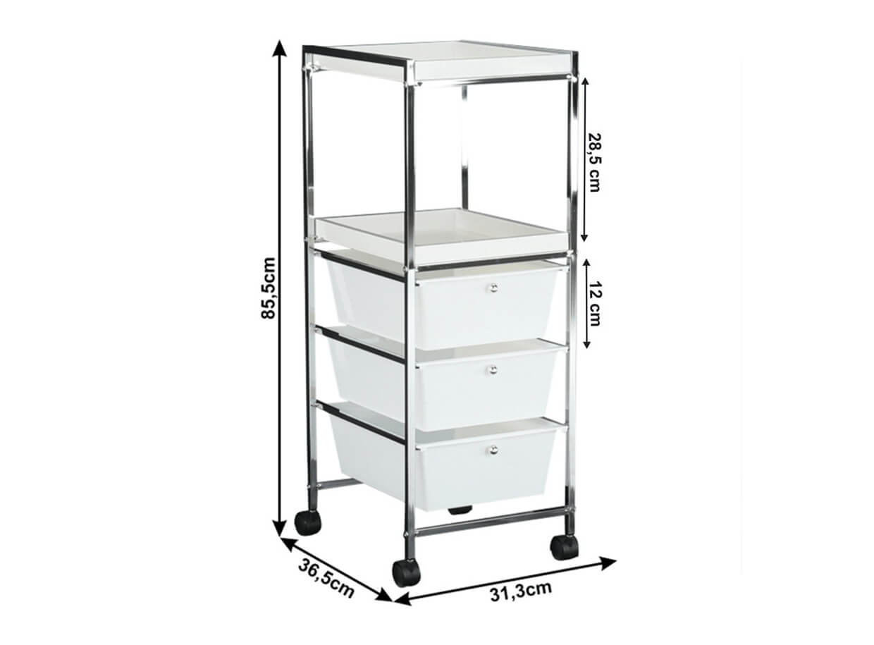 Regál je vyrobený z plastu a chrómu a má výšku 85,5 cm. Disponuje dvomi policami a tromi hlbokými zásuvkami na odkladanie masážnych olejov, rôznych masážnych pomôcok, tejpov, kozmetiky alebo uterákov.
