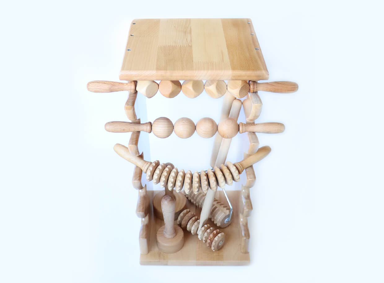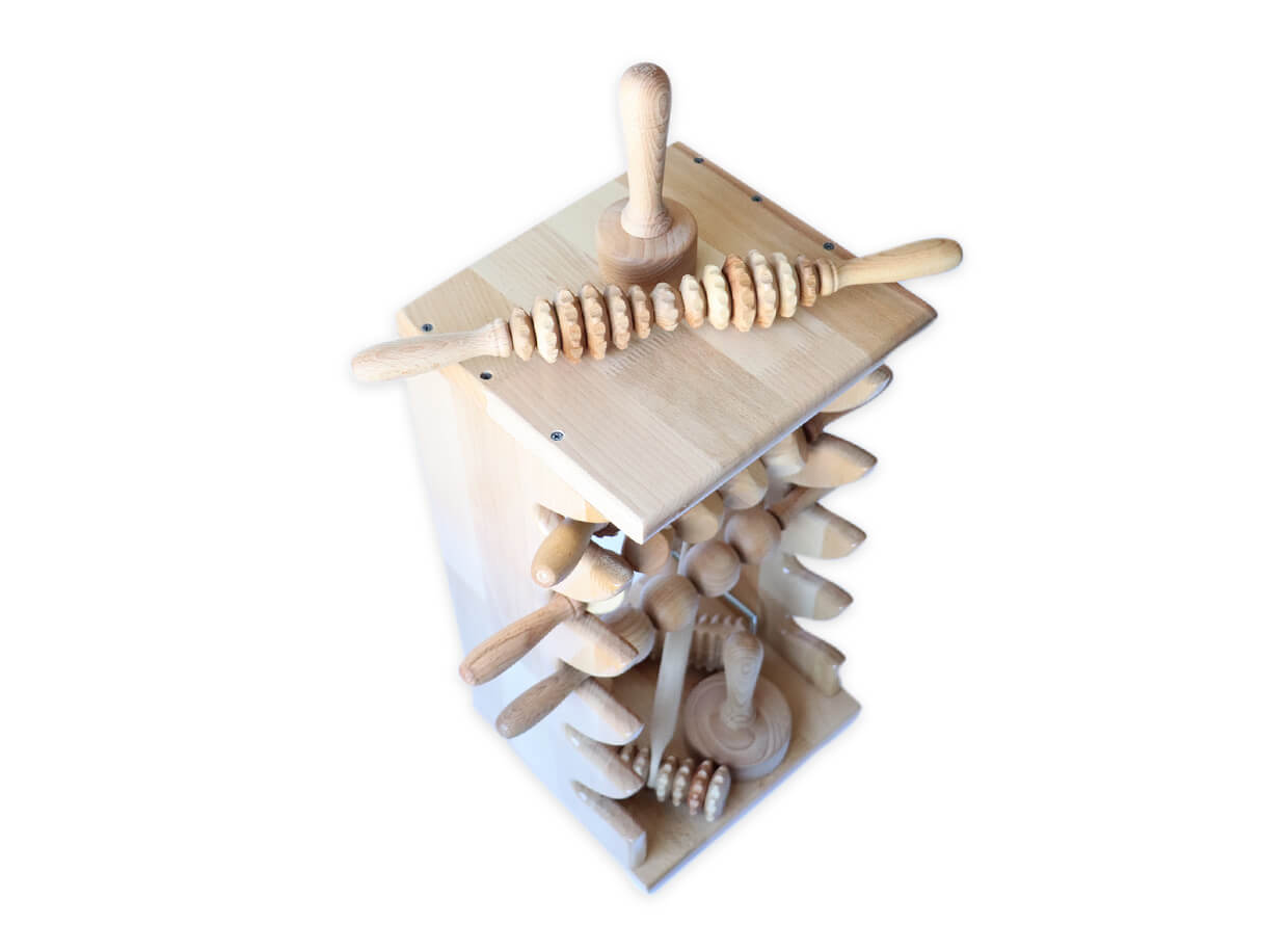 Polica na maderoterapiu šetrí priestor, valčeky budete mať vždy poruke. Vo valčekoch a pomôckach uložených v polici máte dokonalý prehľad, takže vždy siahnete po tom správnom nástroji.
