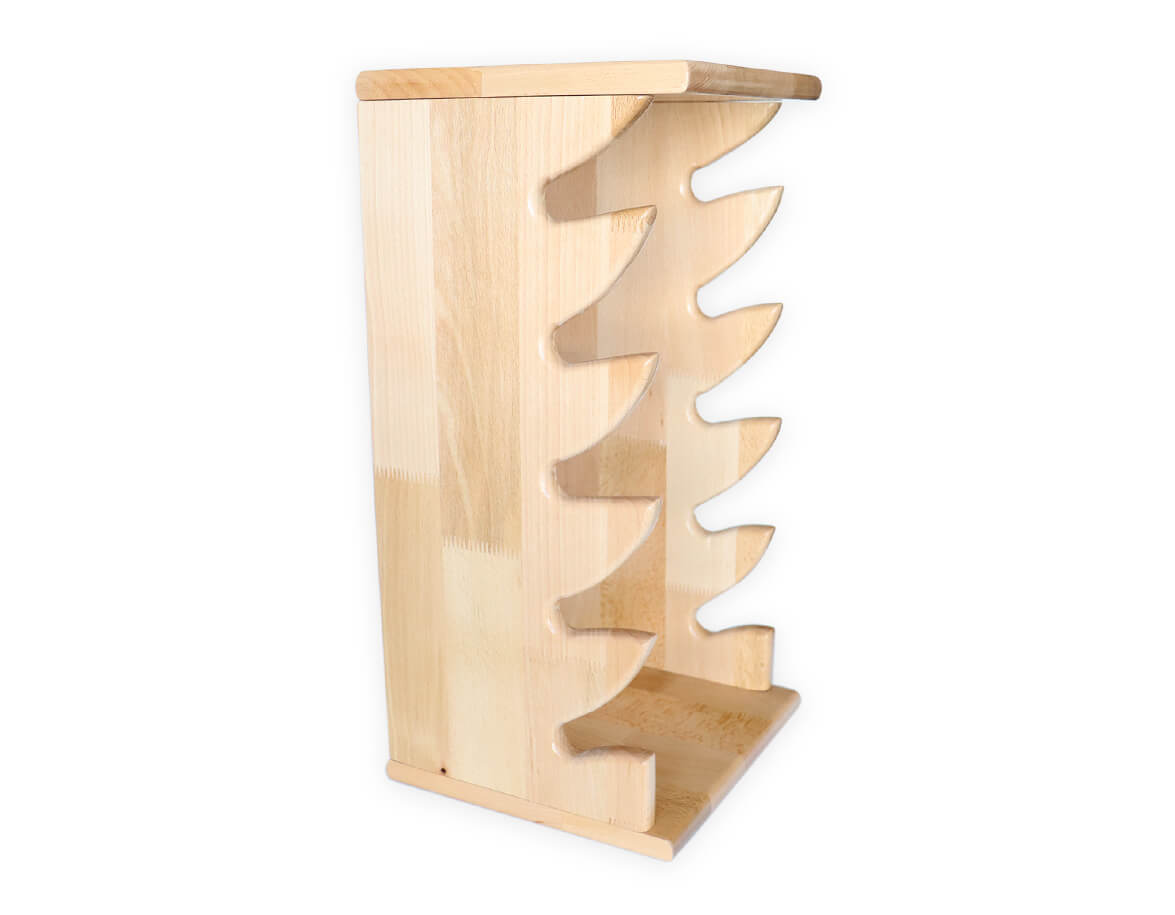 Polica z lakovaného bukového dreva na odkladanie valčekov a pomôcok na maderoterapiu. Praktická polica má 5 zárezov po oboch stranách, do ktorých si uložíte valčeky na maderoterapiu. Horná a spodná polička regálu poskytujú priestor pre ďalšie vybavenie na maderoterapiu ako sú banky alebo stierka.