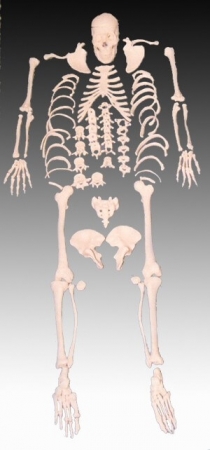 Rozobratá kostra človeka v životnej veľkosti, s lebkou z 3 častí a pravou rukou a nohou v celku (spojenou drôtom).