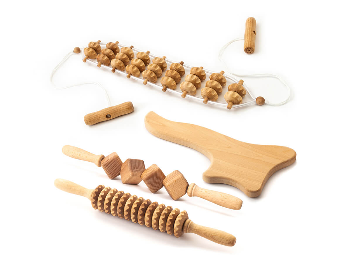 Set na maderoterapiu obsahuje 4 rôzne nástroje z bukového dreva. Je vhodný na automasáž alebo na použitie na doma, ale uplatní sa aj v profesionálnom salóne.