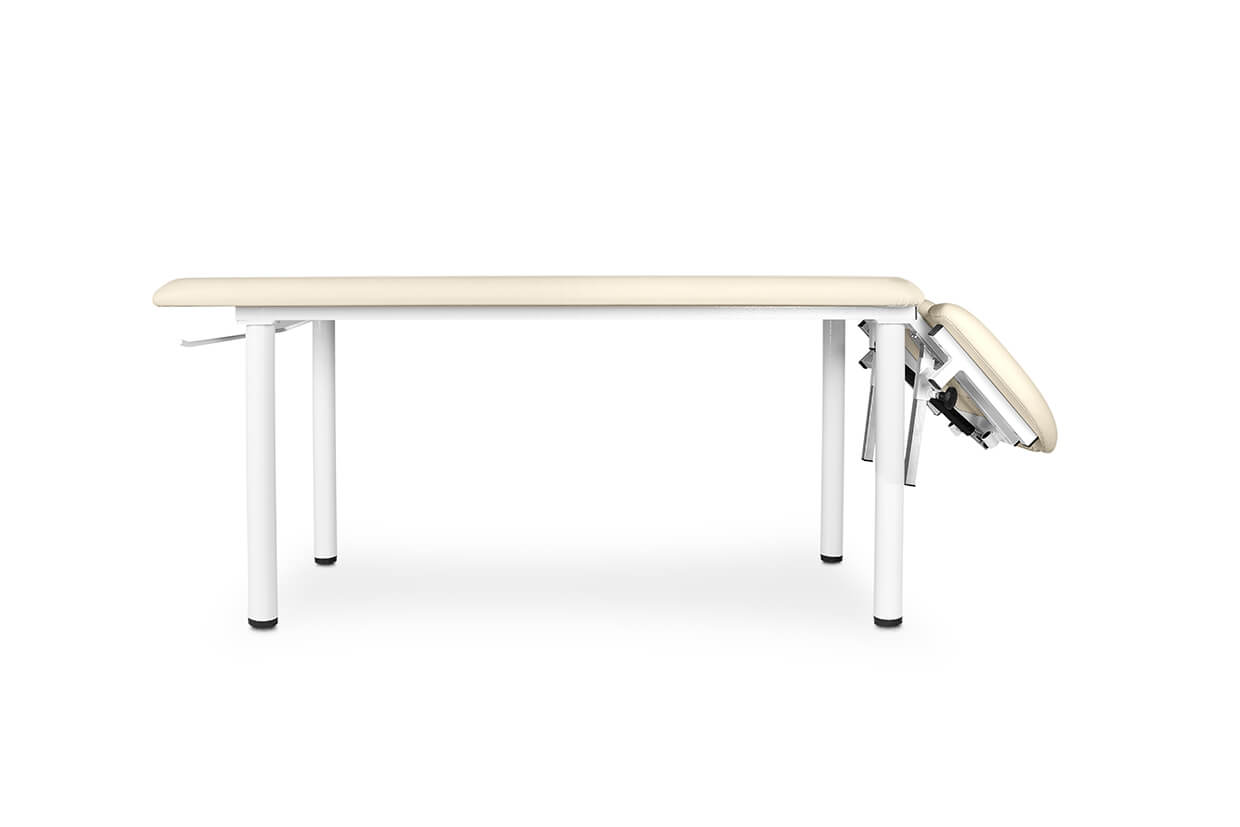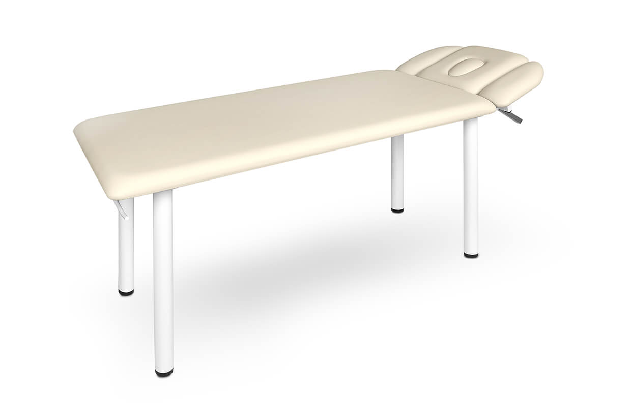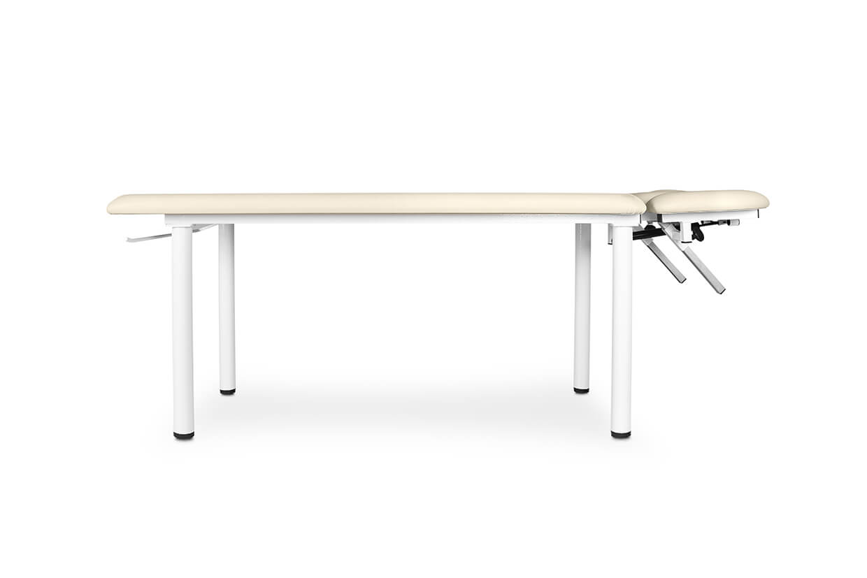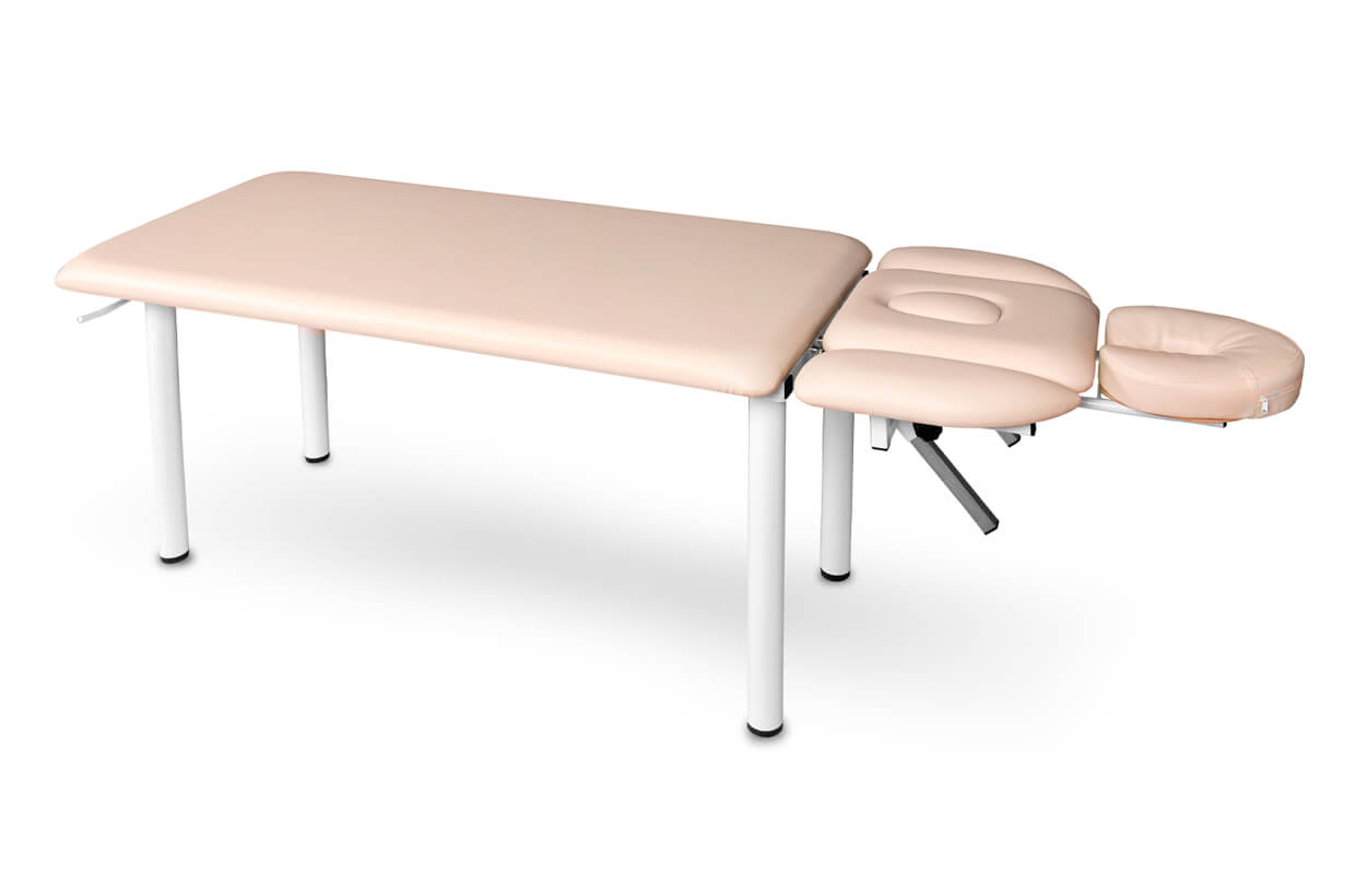 Stabilné a pohodlné dvojdielne fyzioterapeutické a masérske lehátko s pevnou výškou. Vrchná časť lehátka je rozdelená na 3 časti - stredová časť podopiera hlavu a bočné lakťové opierky sa dajú posúvať a jednoducho aretovať v ľubovoľnej polohe až 14 cm pod úroveň hlavovej časti. Zároveň je možné vrchnú časť jednoducho napolohovat pomocou plynovej vzpery až do uhla 45° nad úroveň lehátka alebo 35° pod úroveň lehátka. Lehátko je pohodlne čalúnené 4 cm hrubým molitanom a kvalitnou, ľahko čistiteľnou koženkou a vybavené výškovo nastaviteľnými protišmykovými nožičkami a držiakom na 50 cm plachty.
