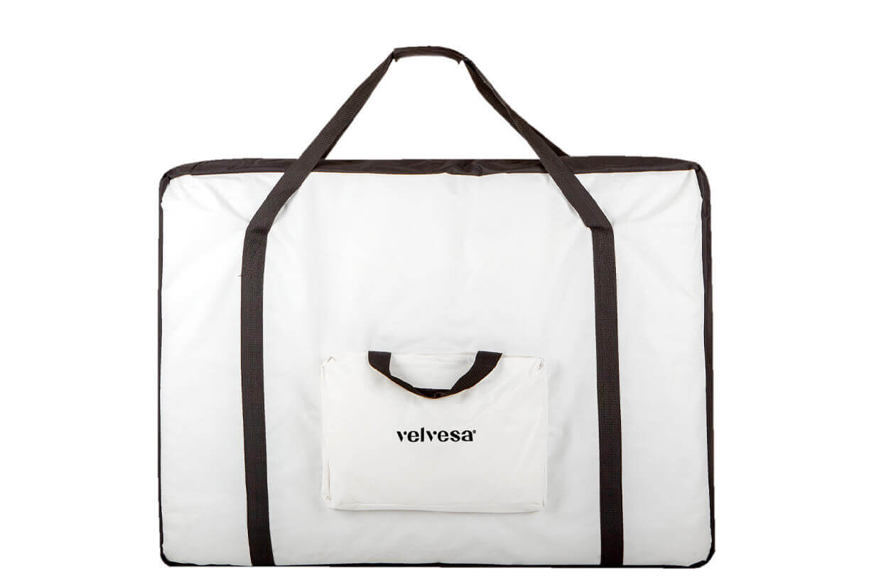 Taška sa zapína na zips a je vybavená dvoma pevnými popruhmi, ktoré umožňujú pohodlné a bezpečné prenášanie masážneho stola. Na prednej strane tašky je vrecko na zips a nad ním menší popruh, ktorý zjednodušuje manipuláciu pri premiesťovaní zbaleného masérskeho stola.