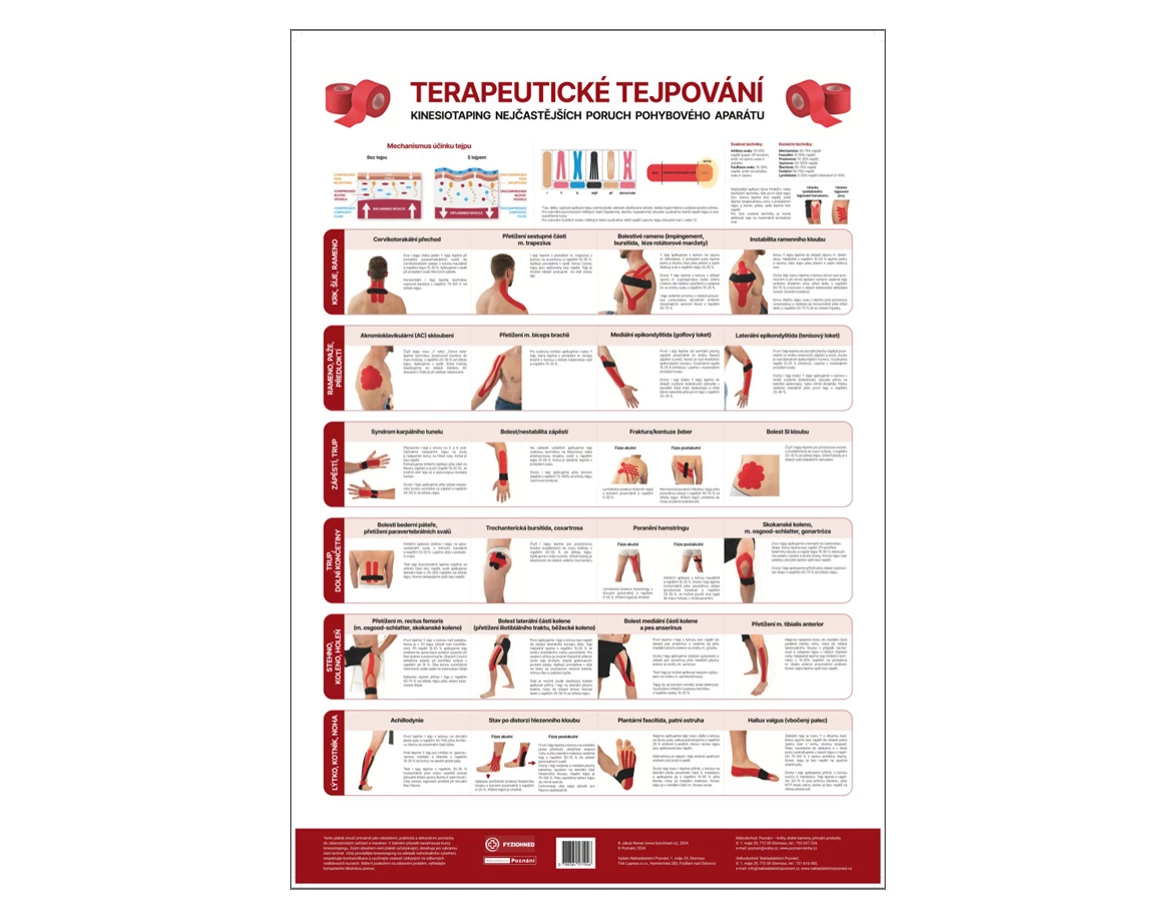 Plagát Terapeutické tejpovanie zobrazuje 29 najčastejšie používaných tejpovacích techník inšpirovaných českými a svetovými terapeutmi. Techniky sú prehľadne rozdelené podľa častí tela a vďaka fotografiám a presným popisom slúži plagát aj ako edukatívna pomôcka.