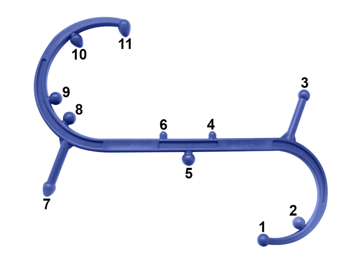 Masážne body 1 a 11 sú vhodné na jemnú masáž chrbta a paží. Na reflexnú masáž chodidiel môžete použiť body 2 a 10. Body 4 a 6, ktoré sa nachádzajú v centrálnej časti masažéra, slúžia na masáž krížov a chrbta. Pre masáž šije a spodnej časti lebky sú vhodné body 8 a 9. Ostatné masážne body 3, 5 a 7 môžete použiť podľa potreby, na ktorúkoľvek časť tela.