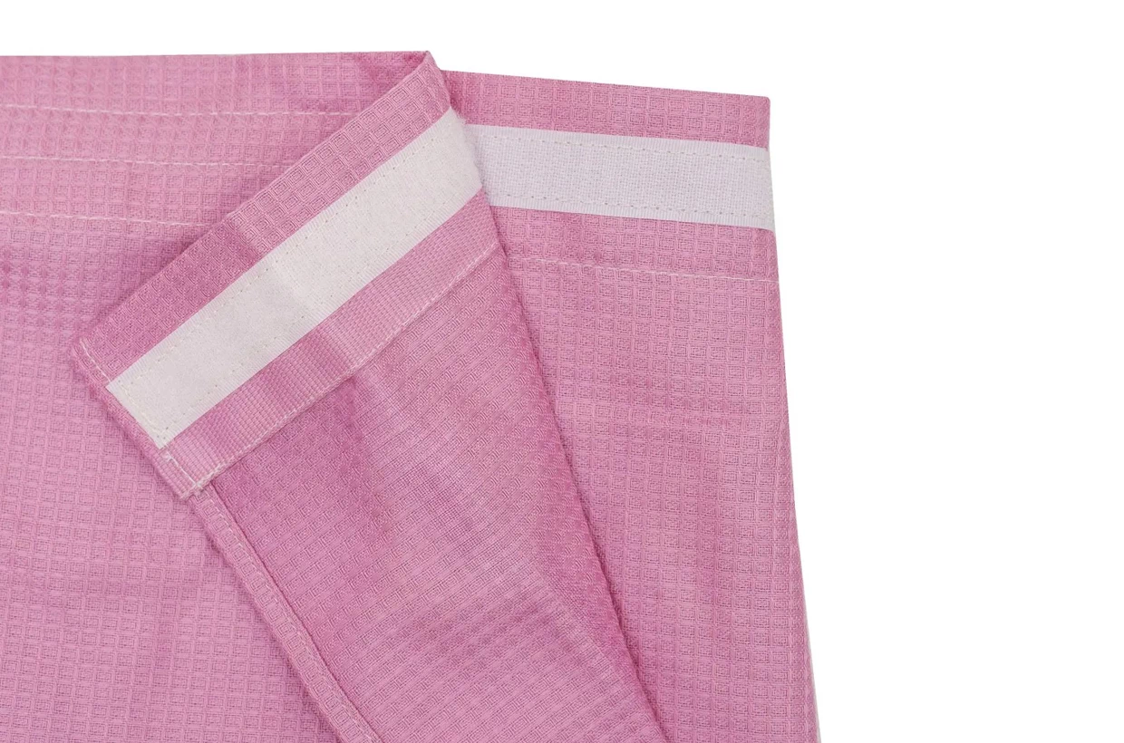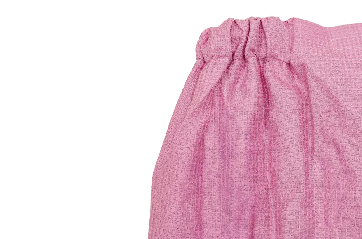 Ľahučký saunový kilt pre dámy v jemnej ružovej farbe je vyrobený zo 100% bavlny v kockovej (wafle) úprave. Látka tým dostáva štruktúru, ostáva nepriehľadná, no ľahká a vzdušná.