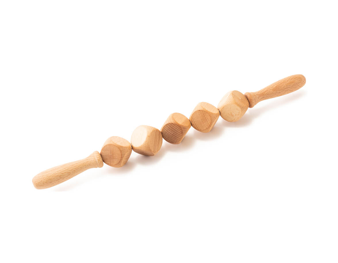 Masážny valček zložený z 5 kociek so zaoblenými hranami z bukového dreva. Tvarované rukoväte príjemne padnú do dlaní. Valček je vhodný na masážne ošetrenie problematických partií tela s výskytom vyššej vrstvy podkožného tuku, celulitídy alebo povolenej kože, ako sú stehná, zadok, bruško, boky a paže.