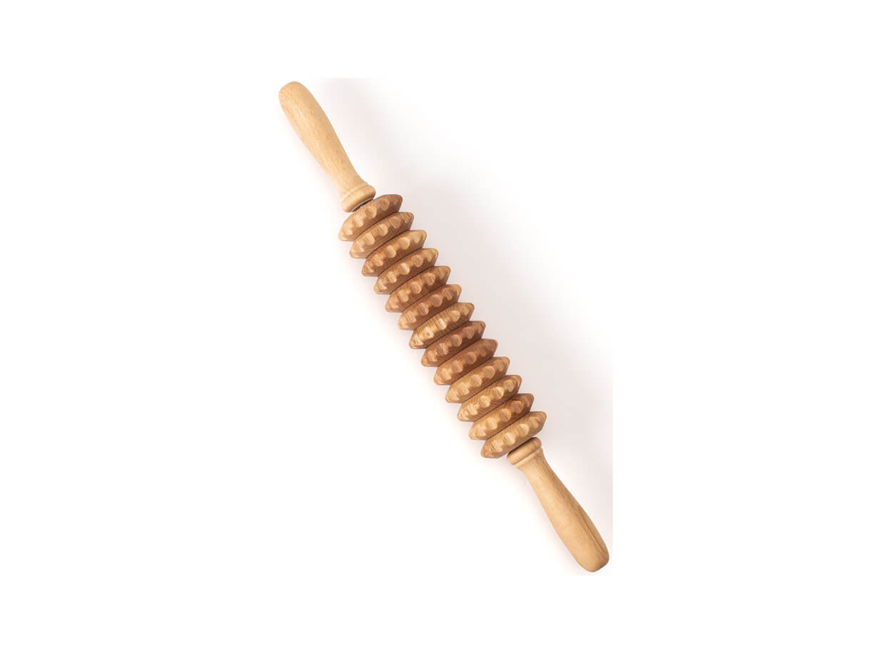 Masážny valček zložený z 13 ozubených koliesok z bukového dreva. Tvarované rukoväte príjemne padnú do dlaní. Valček je vhodný na masážne ošetrenie väčších plôch na problematických partiách tela s výskytom celulitídy, vyššej vrstvy podkožného tuku alebo povolenej kože.