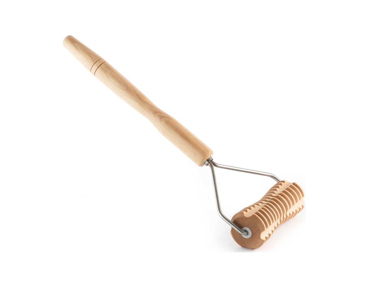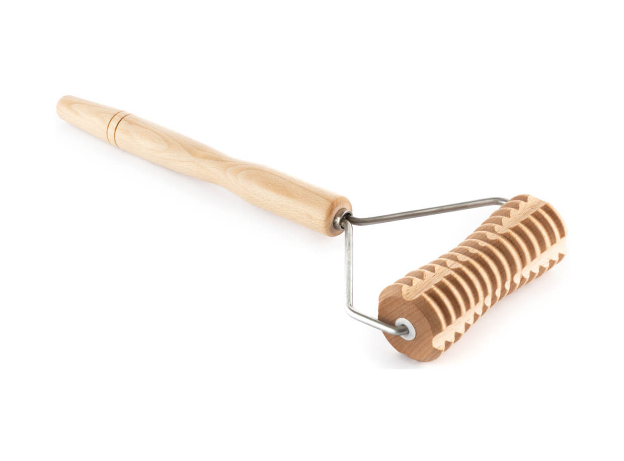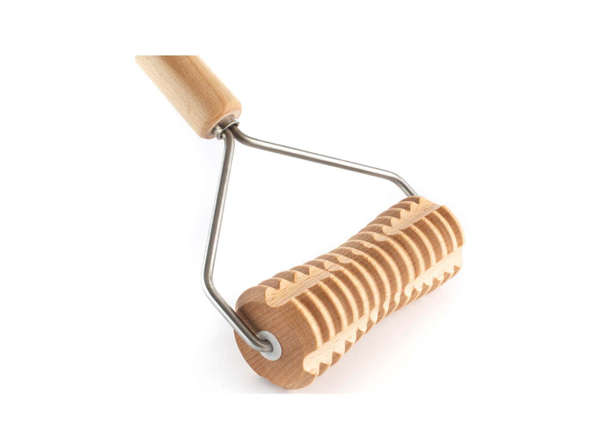 Ryhovaný masážny valček z bukového dreva s rukoväťou v tvare Y. Rukoväť umožňuje vyvinúť primeraný tlak pri masáži a dočiahnuť pohodlne aj na menej dostupné partie tela pri automasáži.