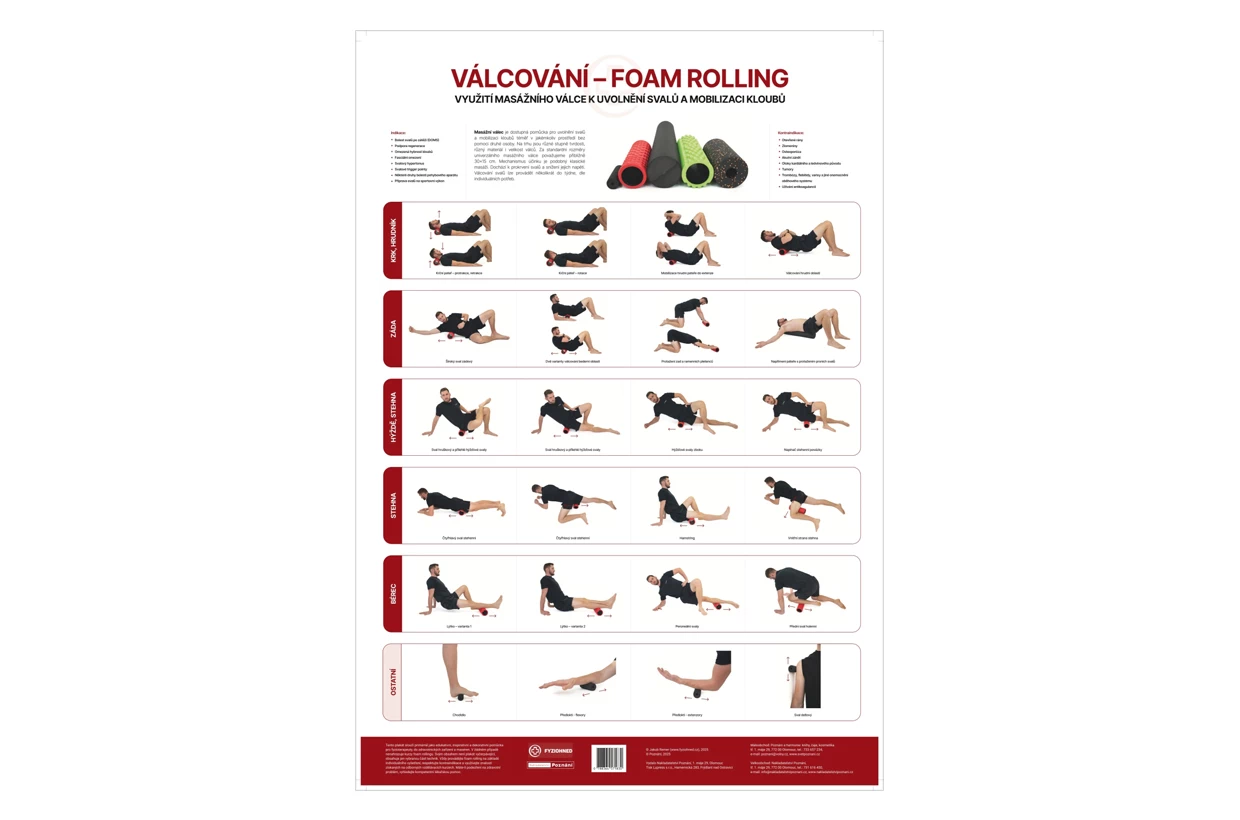 Plagát Valcovanie - foam rolling zobrazuje využitie masážneho valca pre jednotlivca na uvoľnenie svalov a mobilizáciu kĺbov. Konkrétne cviky sú prehľadne rozdelené podľa jednotlivých častí tela.